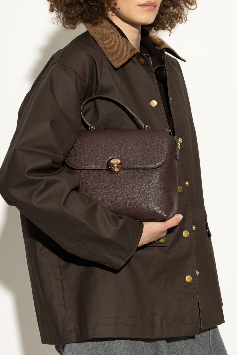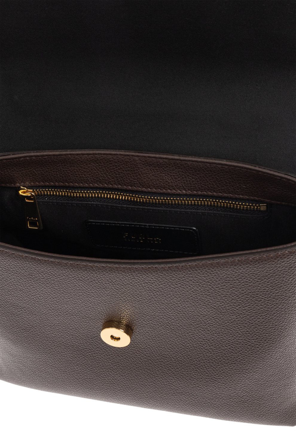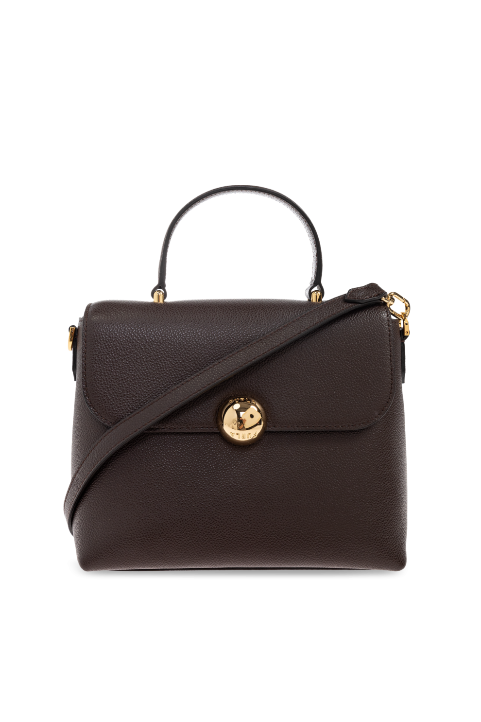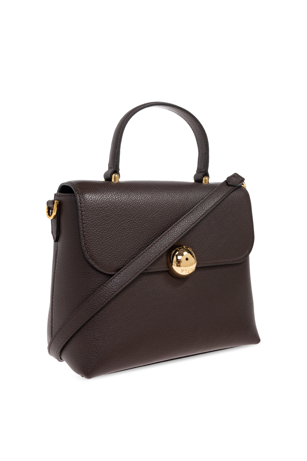 Эта модель впечатляет своим минималистичным, однородным тёмно-коричневым оттенком, без лишних украшений и швов. Эффектный золотистый круглый клапан добавляет изящный штрих и отсылает к итальянскому мастерству. Съёмный плечевой ремень добавляет исключительную функциональность, позволяя носить сумку как в руке, так и через плечо.