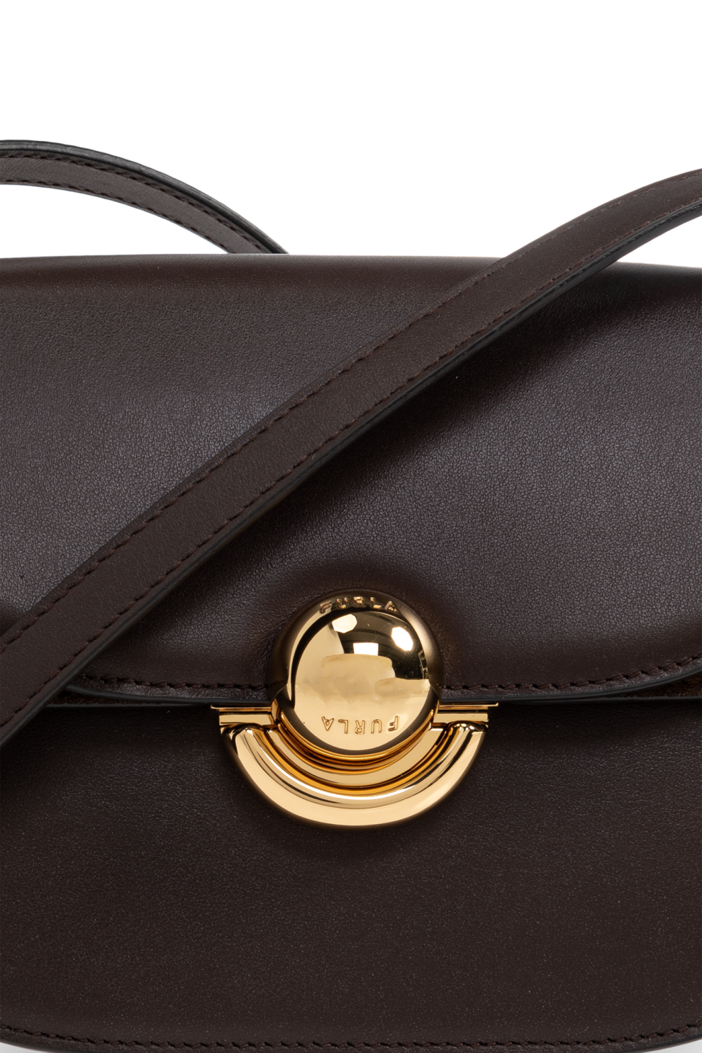 Внешняя часть сумки выполнена из высококачественной натуральной кожи коричневого цвета с матовой отделкой, а внутренняя – из мягкой, обволакивающей ткани. Коричневый цвет – воплощение элегантности, идеально дополняемый золотыми акцентами: круглой застёжкой с изящной гравировкой «FURLA» и изящным логотипом на задней стороне. Длинный регулируемый ремень позволяет удобно носить сумку на плече или через плечо.