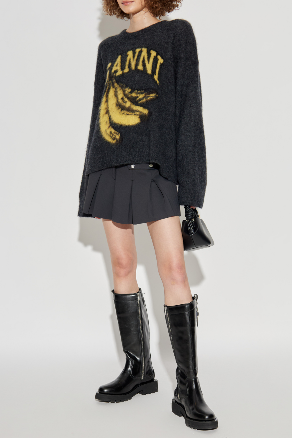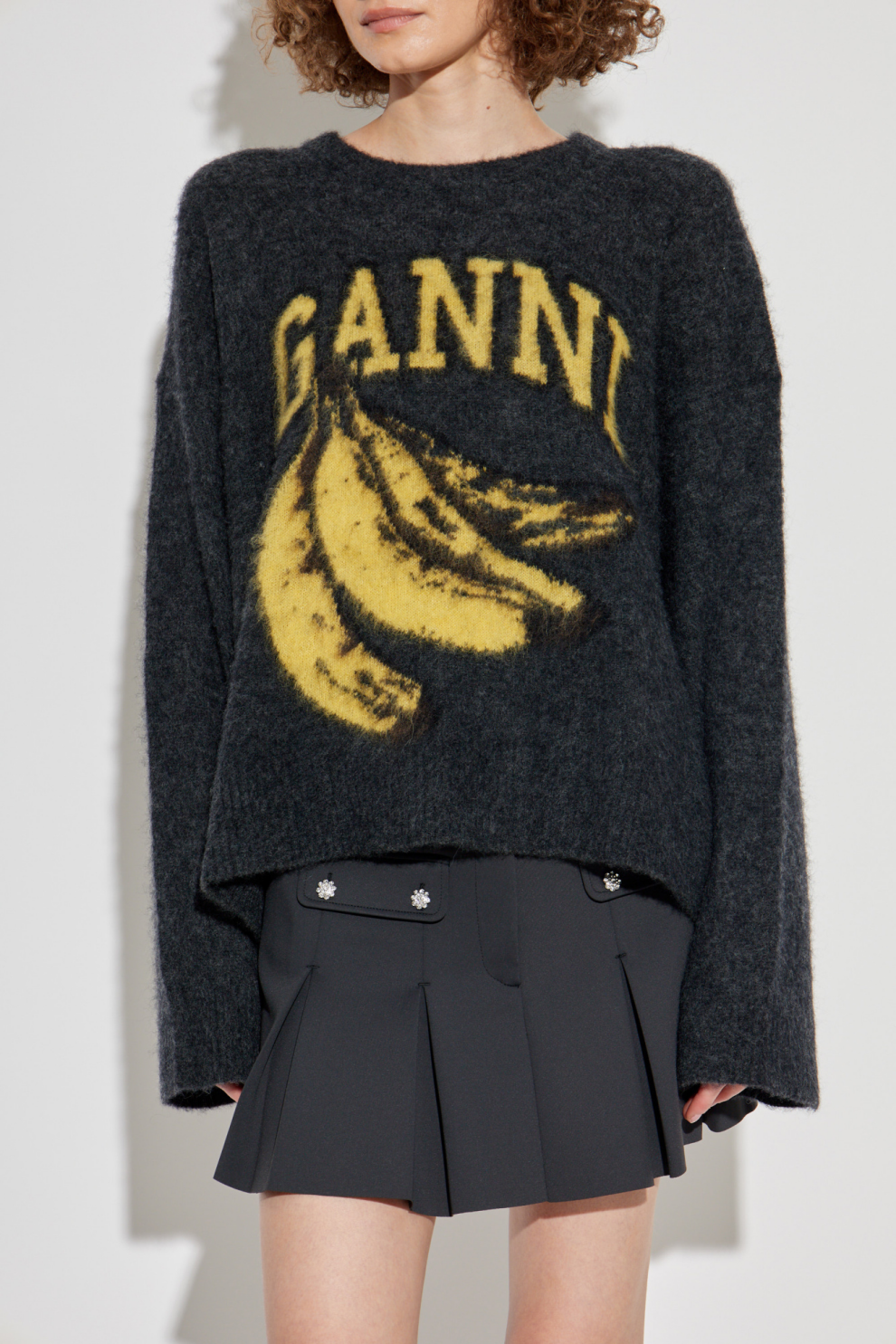 Главный акцент — яркий жёлто-чёрный принт с бананом и контрастным логотипом GANNI, расположенным над ним. Этот узнаваемый мотив отражает характер бренда: игривый, уверенный, с чувством юмора и вкусом к эклектике.