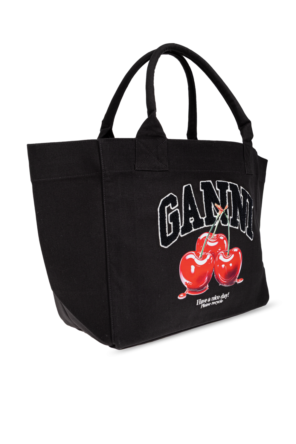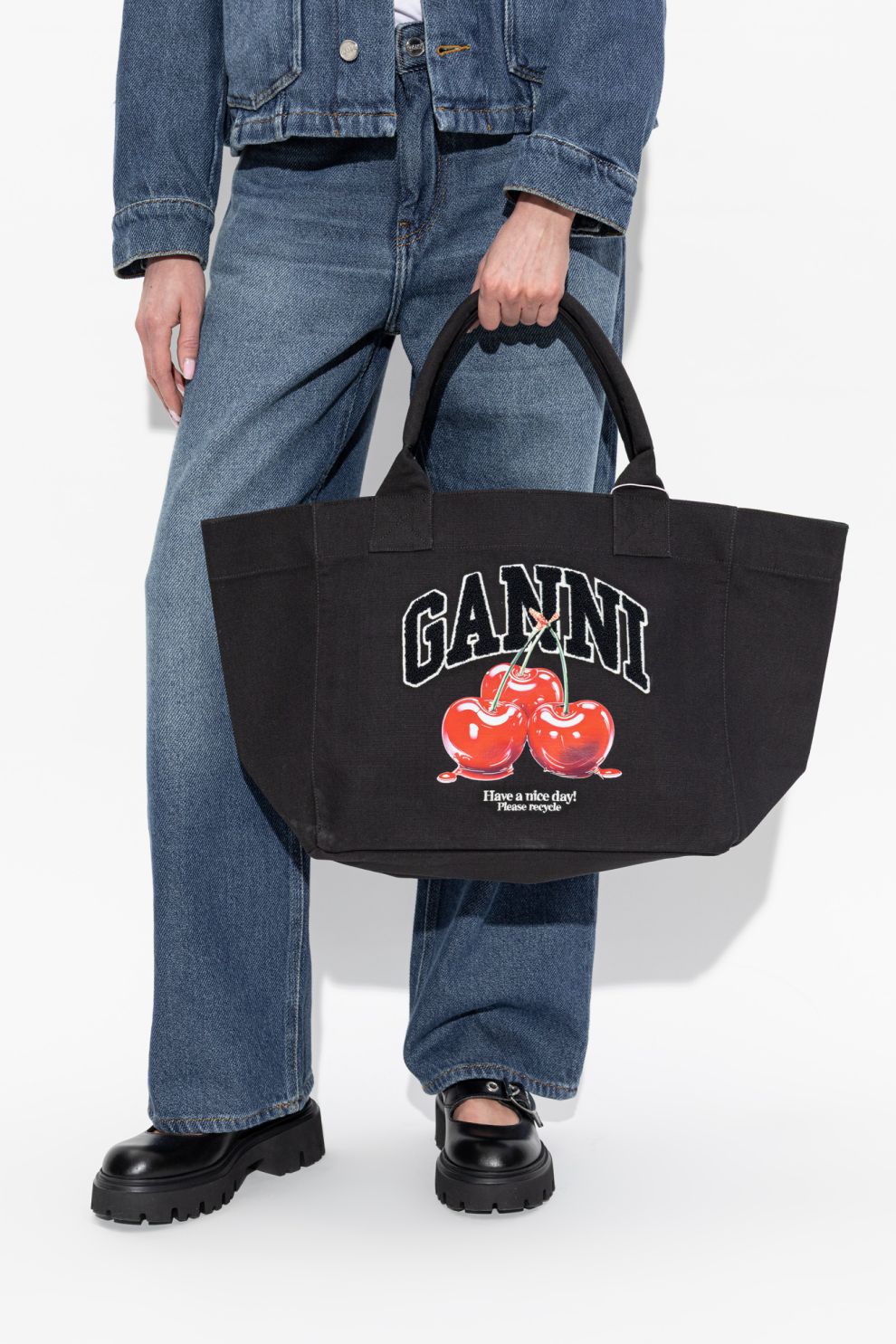 Сумка-шоппер с принтом вишни от GANNI — это выразительное сочетание практичности и фирменной скандинавской игривости, где повседневный аксессуар превращается в стильное заявление.