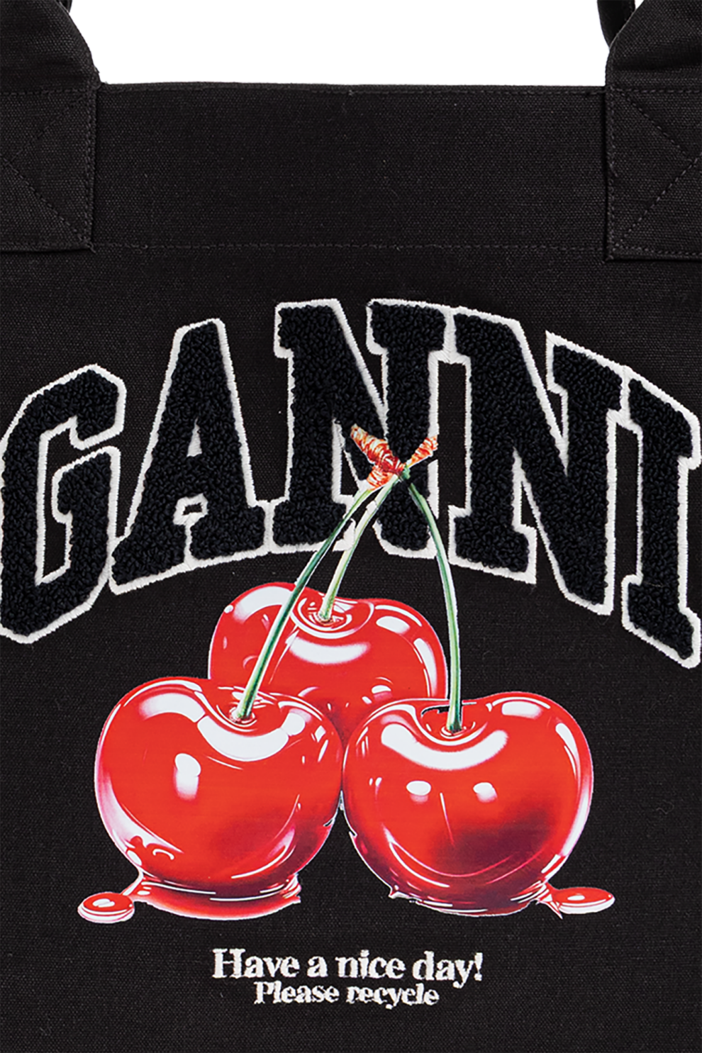 Центральным элементом композиции становится крупный логотип GANNI, дополненный художественным мотивом глянцевых вишен, который добавляет образу лёгкость, свежесть и узнаваемый стиль бренда. Деликатная надпись завершает дизайн, подчёркивая внимание к деталям и современную эстетическую философию.