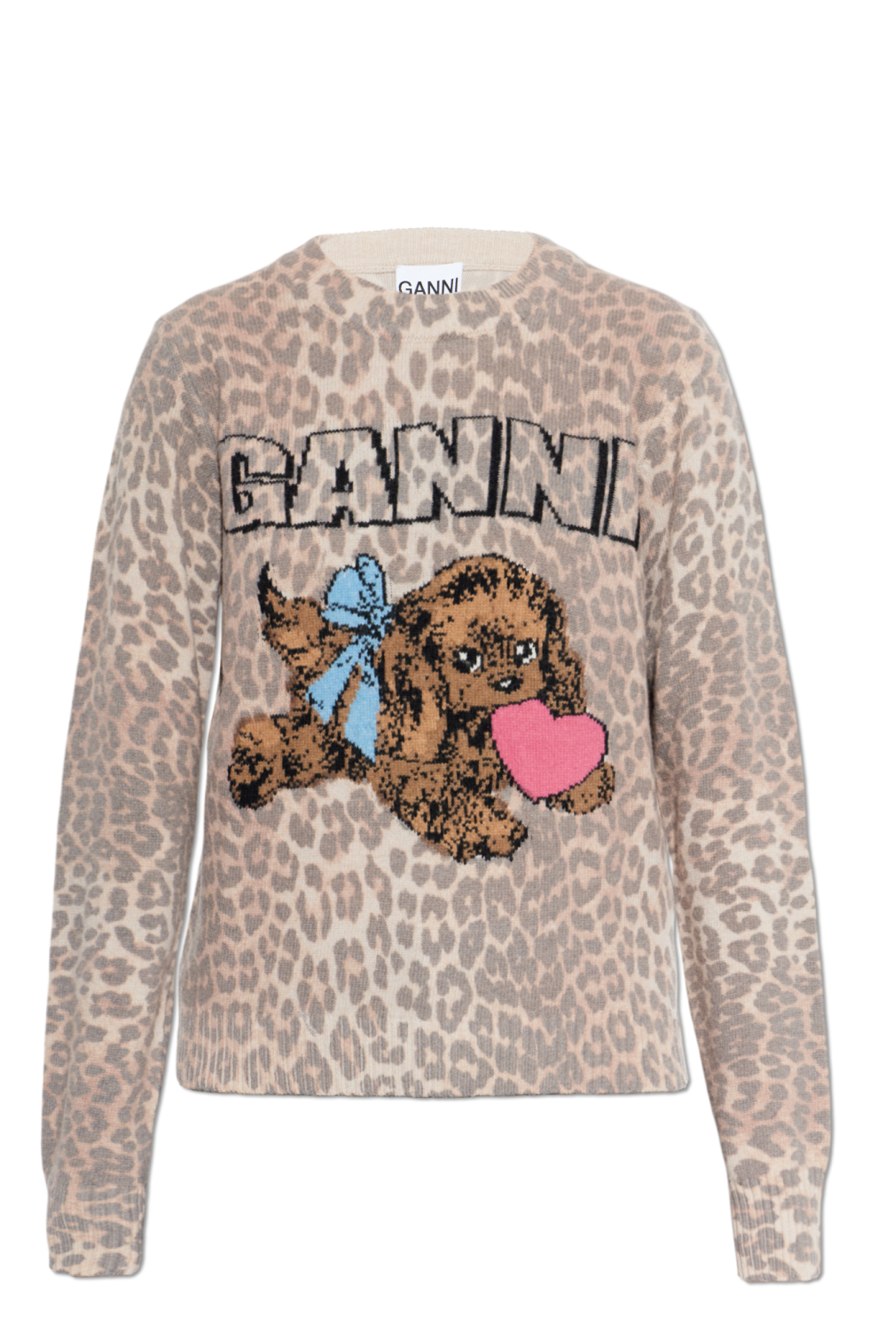 Передняя часть свитера украшена смелым принтом в стиле гепарда и уникальной тканой иллюстрацией щенка с синим бантиком и розовым сердечком, превращающей изделие в выразительный акцент образа.