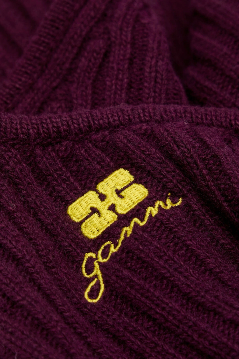 Глубокий бордовый оттенок придаёт образу выразительность и утончённость, а жёлтая вышивка с логотипом добавляет энергичный акцент и создаёт контрастную игру цвета. Рельефная фактура резинки и удлинённые завязки, которые можно обернуть вокруг шеи в качестве шарфа, придают аксессуару архитектурную форму и лёгкий намёк на спортивный стиль.