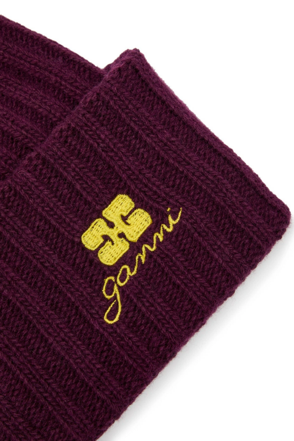 Рельефная вязка в рубчик создаёт объёмную текстуру и подчёркивает архитектурную форму, а жёлтая вышивка с логотипом GANNI на отвороте добавляет выразительный контраст и узнаваемый акцент бренда.