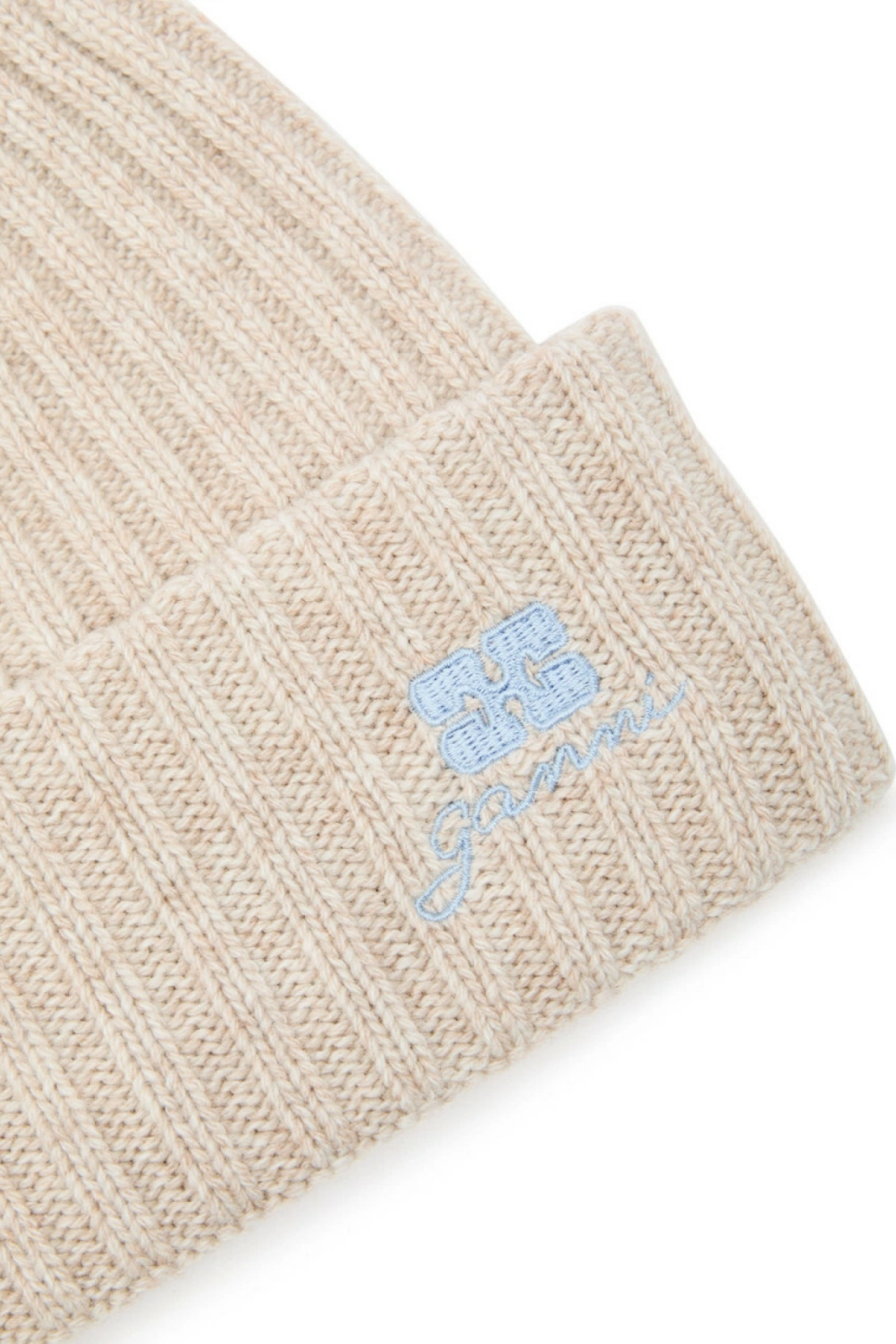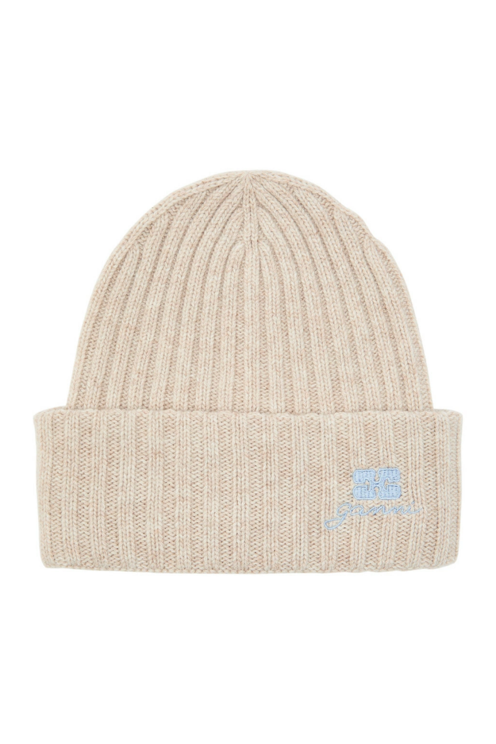 Фактурная резинка придаёт изделию современный объём, а голубой вышитый логотип GANNI на широком отвороте создаёт освежающий контраст, подчёркивая характер бренда и его любовь к ярким деталям.