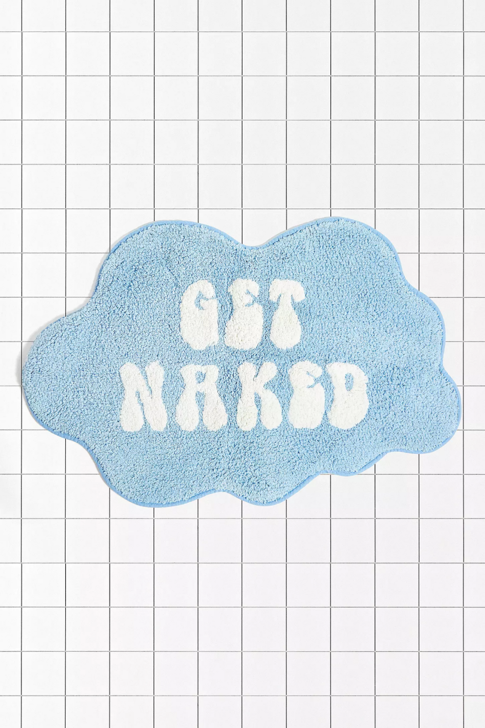 Голубой декоративный тафтинговый коврик в форме облака с фактурной надписью "Get Naked" от Орбита Home – арт-объект для стильного интерьера.