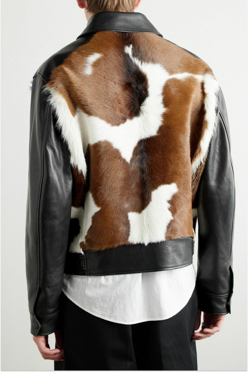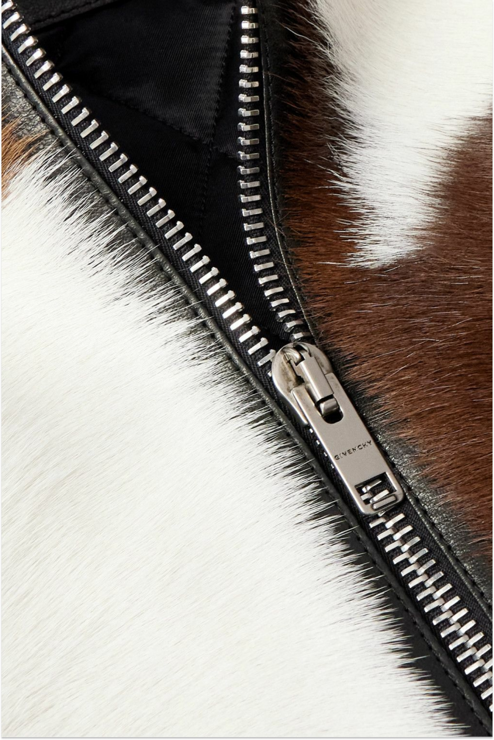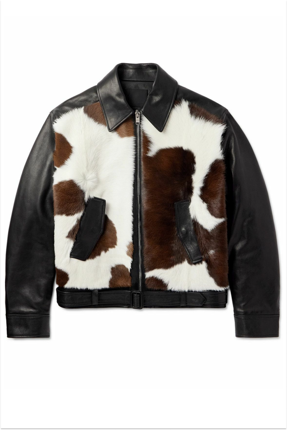 Куртка Givenchy — выразительное изделие для тех, кто ценит смелый дизайн и безупречное исполнение. Модель выполнена из мягкой натуральной телячьей кожи и дополнена эффектными панелями из телячьего меха с принтом под корову, создающими яркий визуальный контраст и подчёркивающими характер бренда.