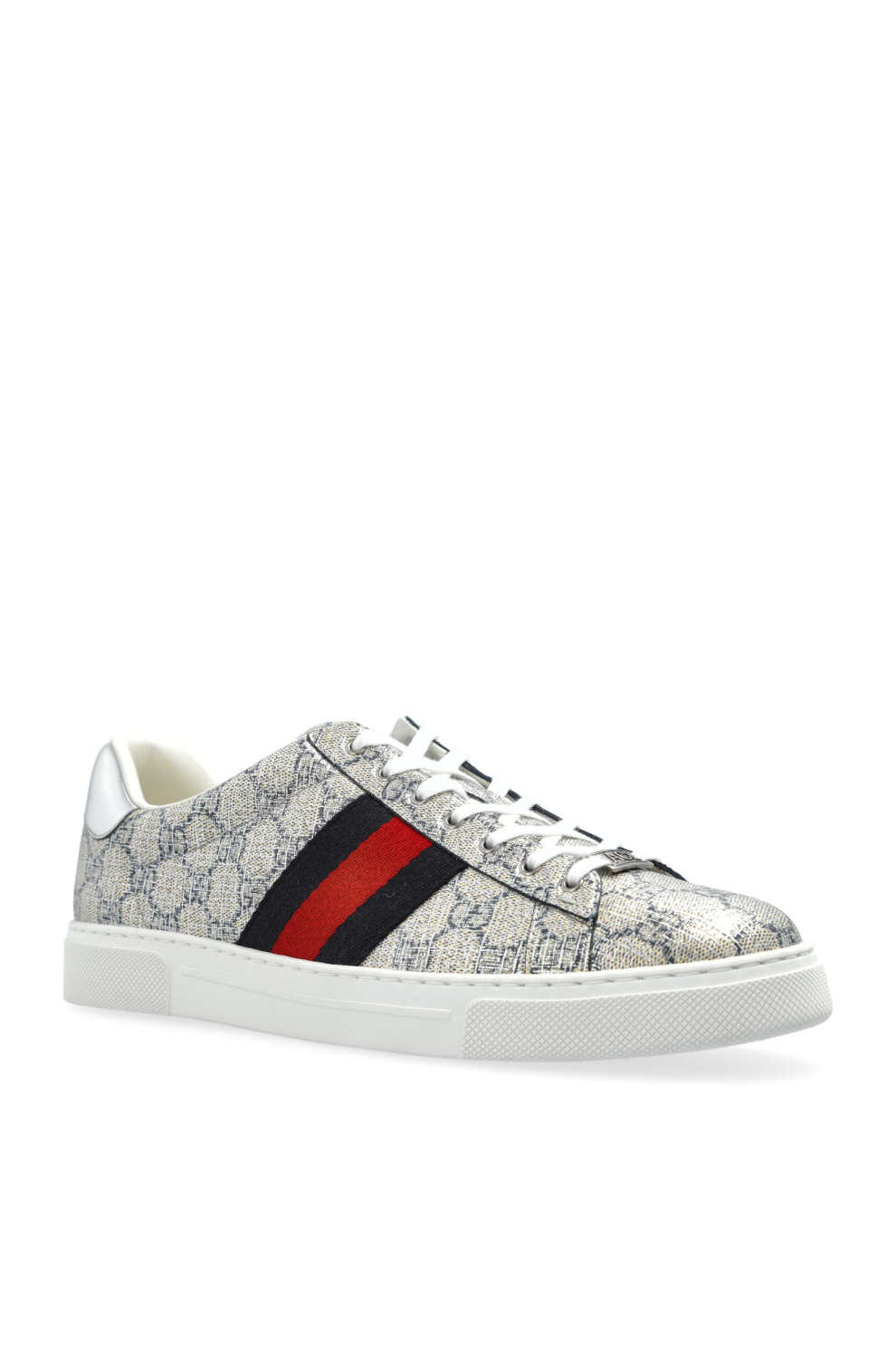 Верх выполнен из фирменного текстиля с монограммой GG Supreme, дополненного высококачественными материалами, что обеспечивает прочность и визуальную глубину. Внутренняя кожаная подкладка гарантирует комфорт и мягкость при носке, подчеркивая премиальный уровень исполнения. Контрастные полосы Web в красно-темно-синей гамме на боковых панелях добавляют характерный акцент, отражающий спортивное наследие бренда.