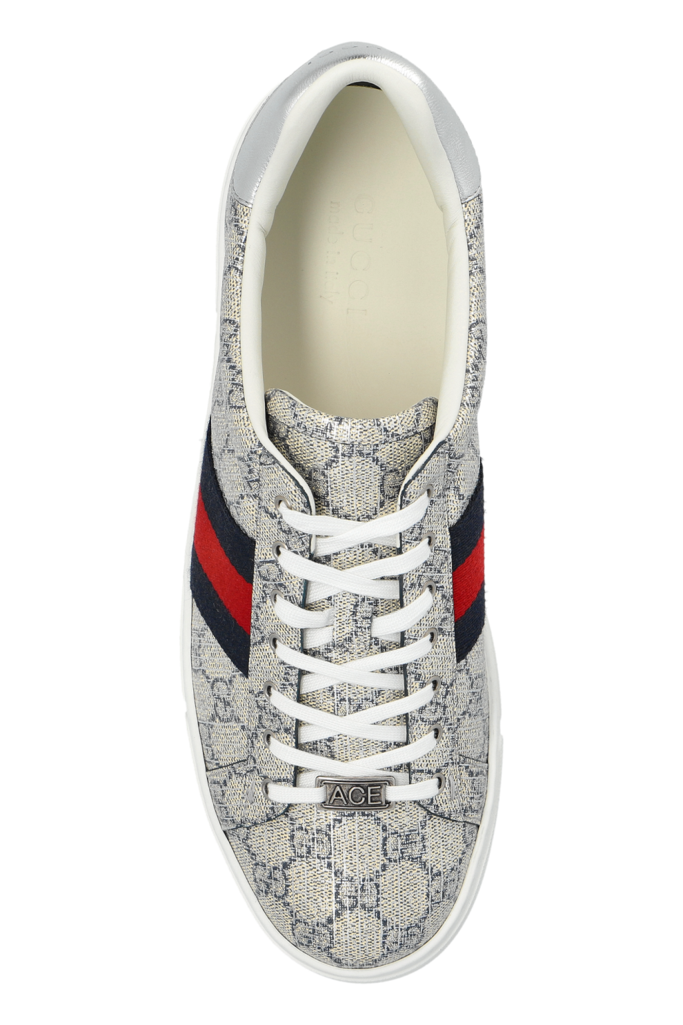Серебристые кроссовки Gucci Ace Web GG Supreme Monogram — это выразительное воплощение фирменного стиля Дома, где классические архивные элементы переосмыслены в современном, эффектном ключе. Низкий силуэт модели подчеркивает ее универсальность, а металлизированный серебристый оттенок придает образу яркость и актуальную динамику.