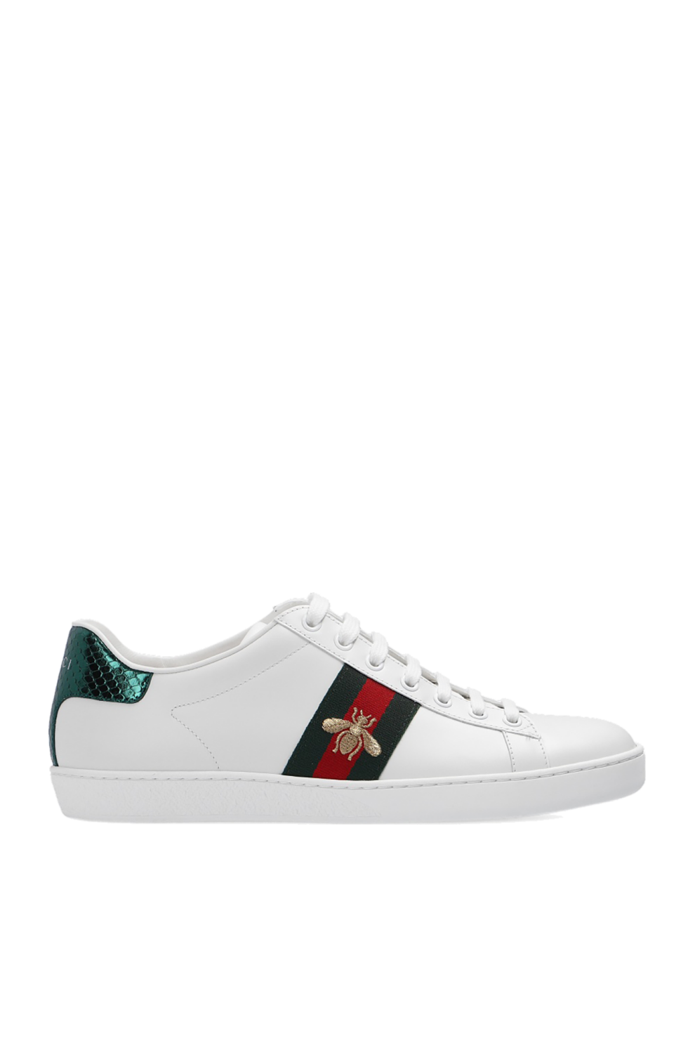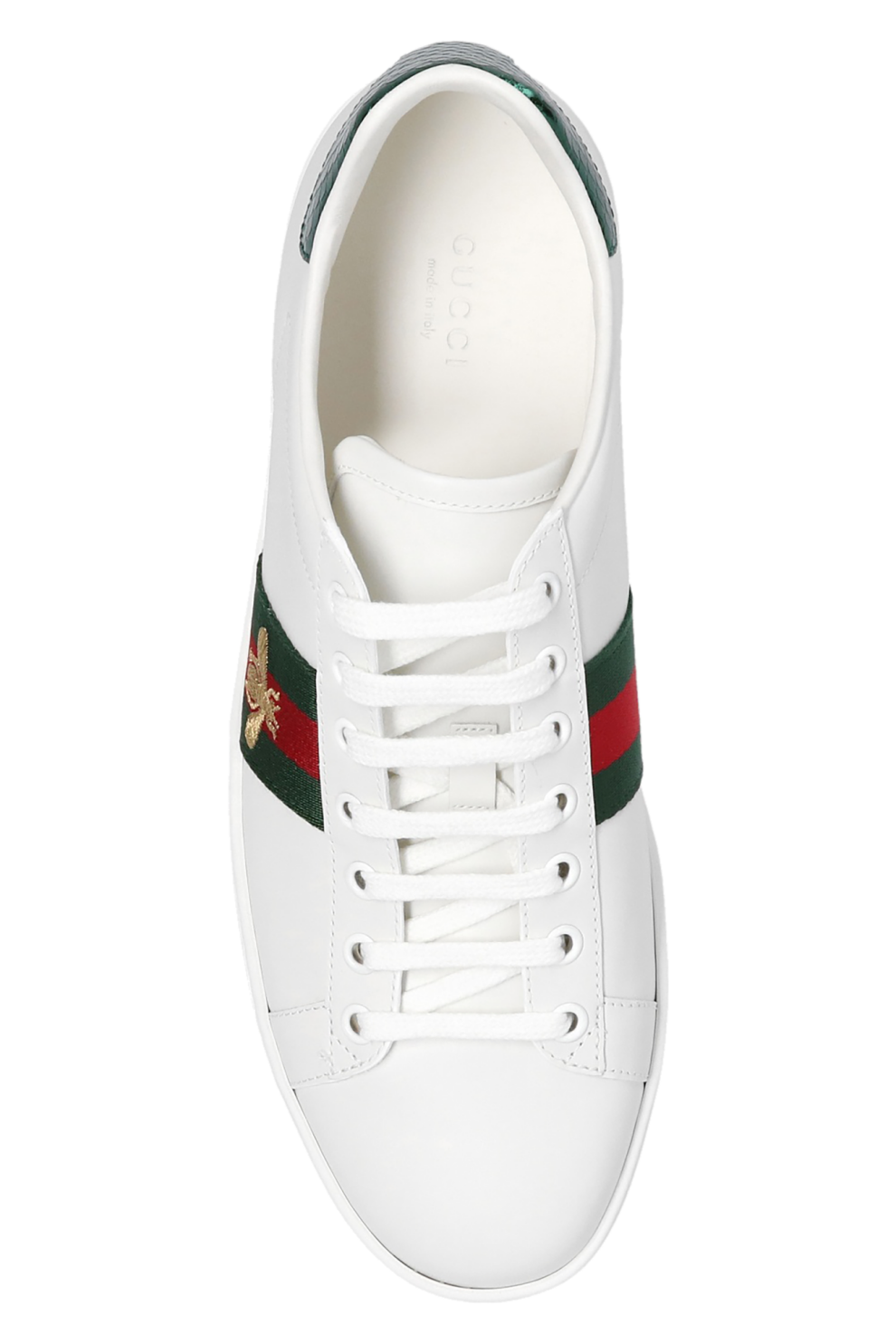Верх выполнен из гладкой натуральной кожи высочайшего качества, отличающейся мягкостью, прочностью и благородной фактурой. Фирменная зелено-красно-зеленая полоса Web проходит вдоль боковых панелей, создавая мгновенно узнаваемый акцент, а вышитая пчела — один из архивных символов Gucci — добавляет образу изысканную деталь с историческим подтекстом.