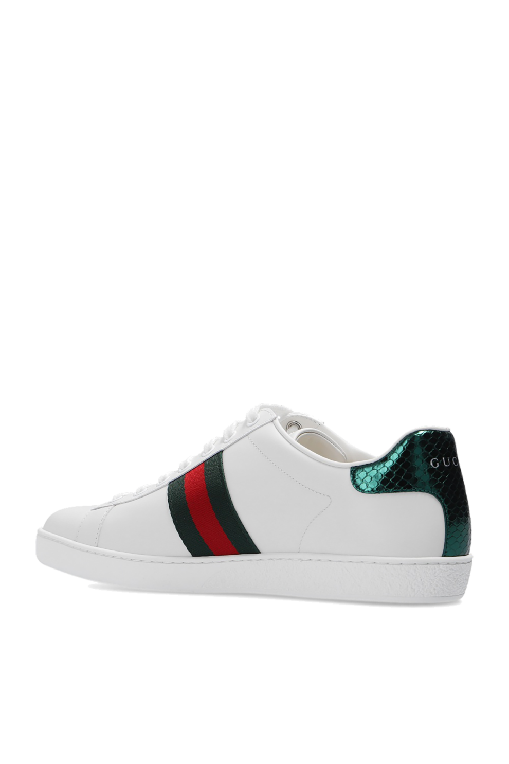 Задник украшен выразительной металлической вставкой зеленого цвета с тиснением под змеиную кожу и нанесенным логотипом, что придает модели дополнительную глубину и характер. Белая резиновая подошва обеспечивает комфорт, амортизацию и надежное сцепление с поверхностью, сохраняя при этом чистоту и целостность дизайна.