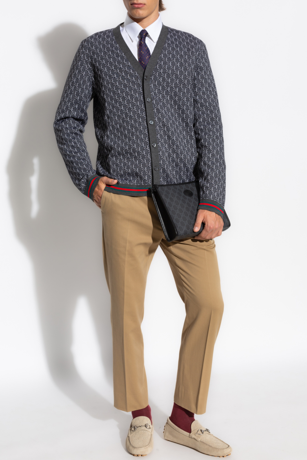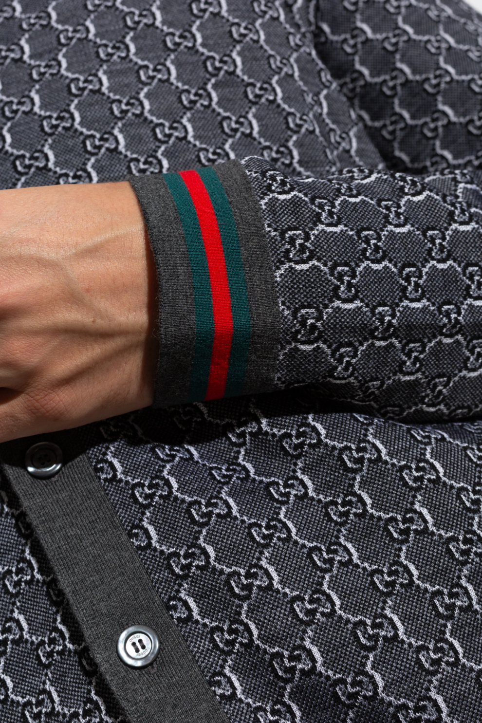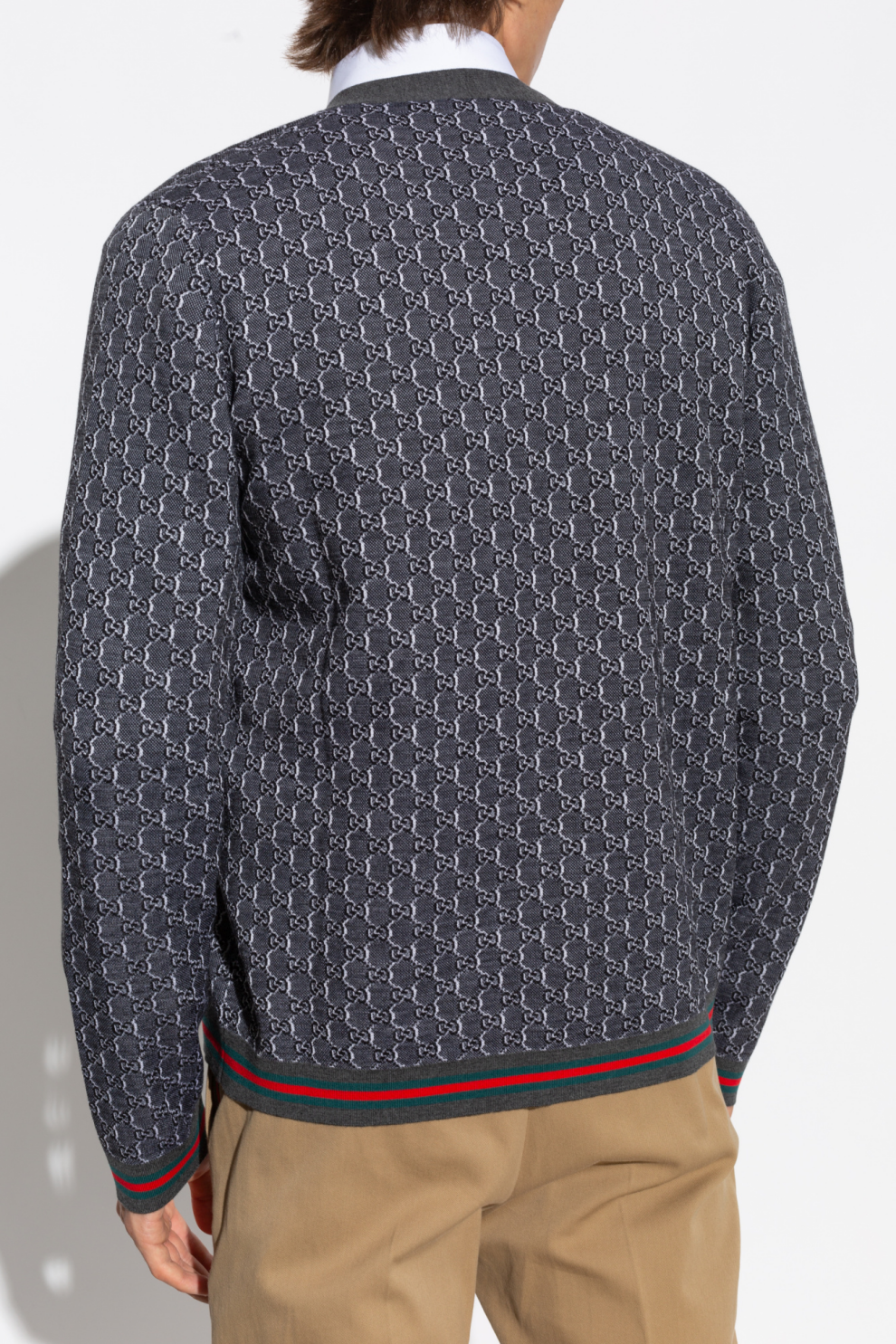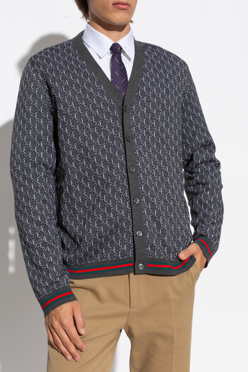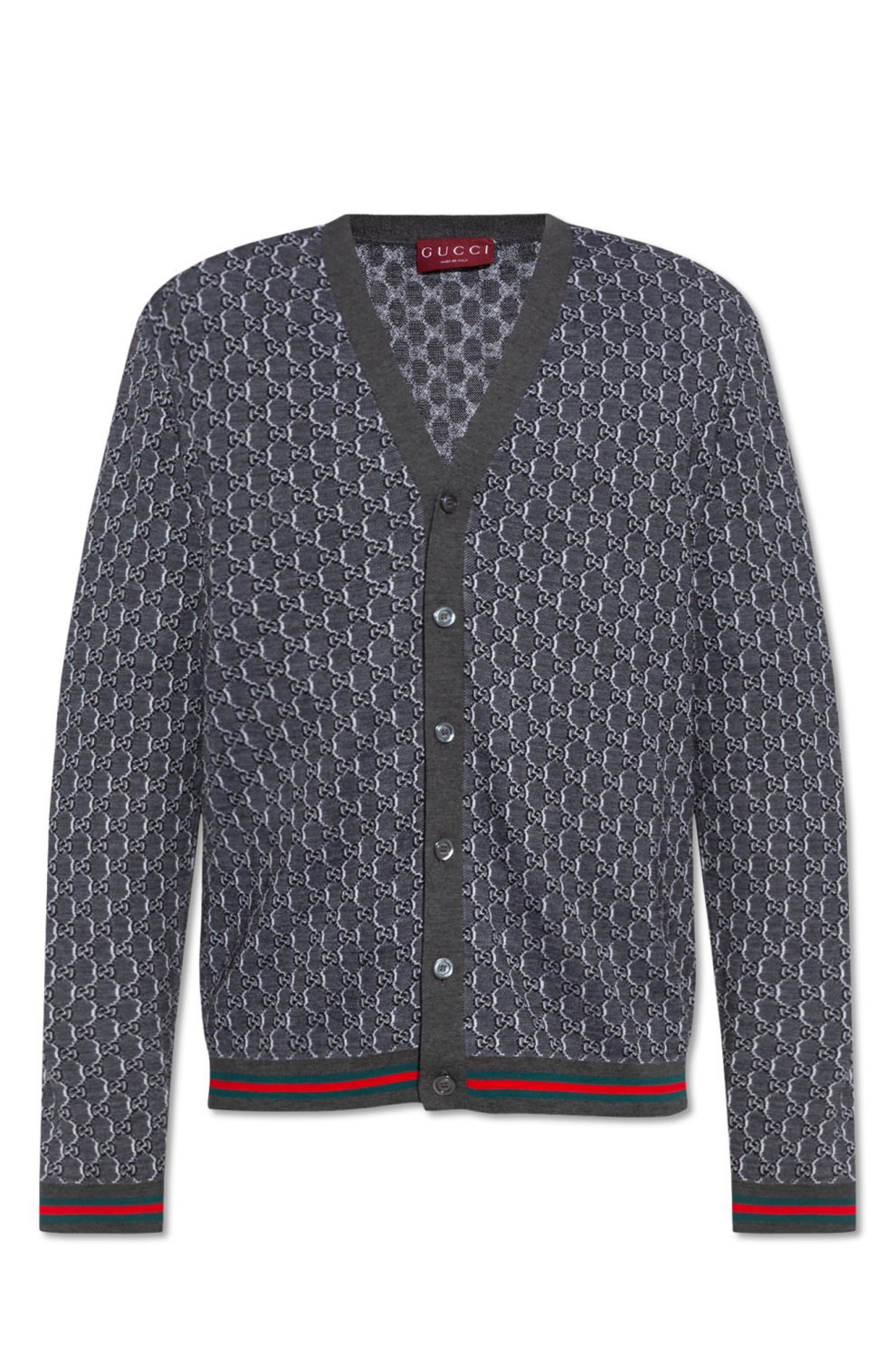 Элегантный серо-чёрно-белый узор GG, охватывающий всю поверхность изделия, отражает узнаваемый почерк Дома Gucci — символ итальянского наследия и статуса. Классический V-образный вырез, длинные рукава и застёжка на пуговицы создают силуэт, в котором сдержанность сочетается с характером.