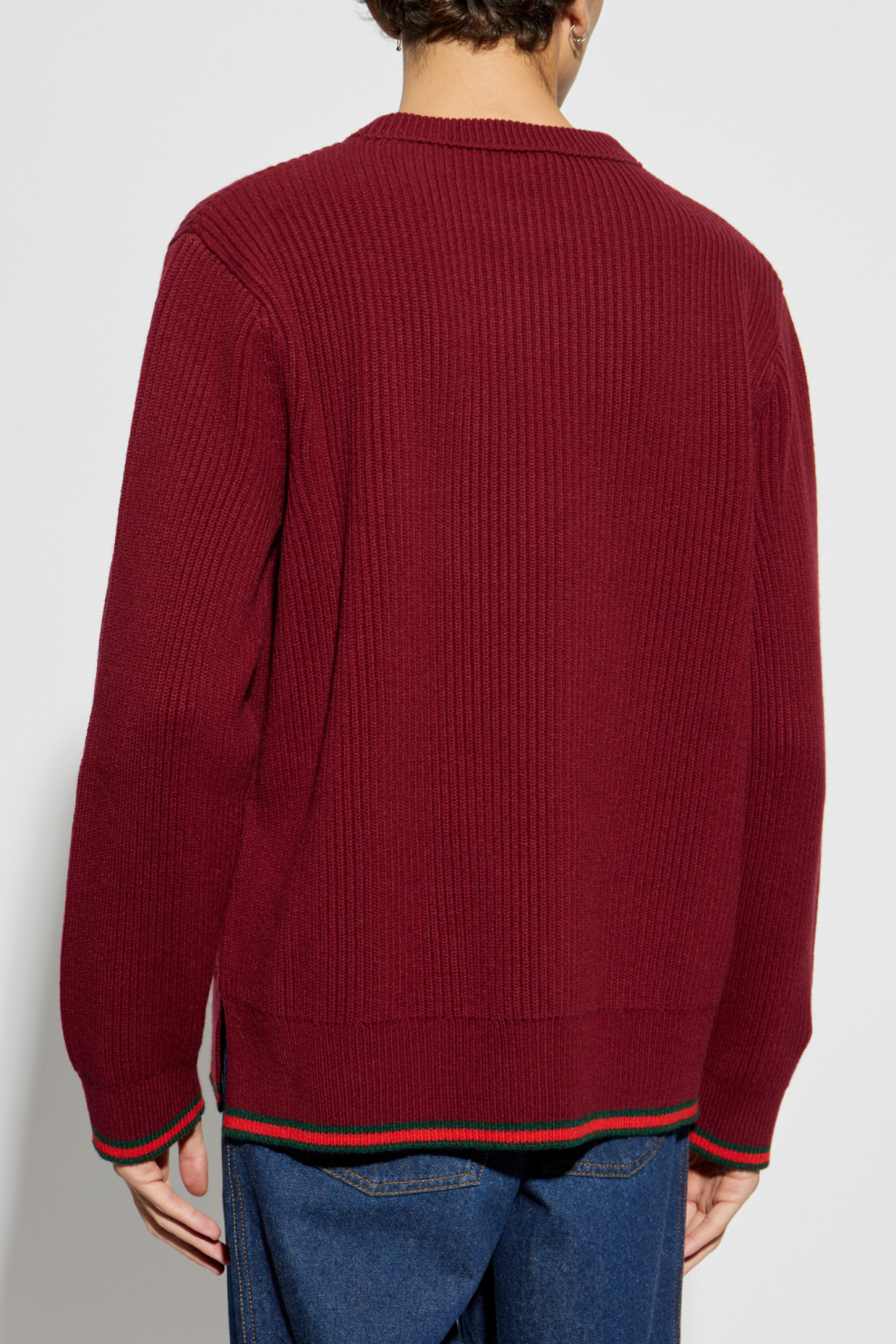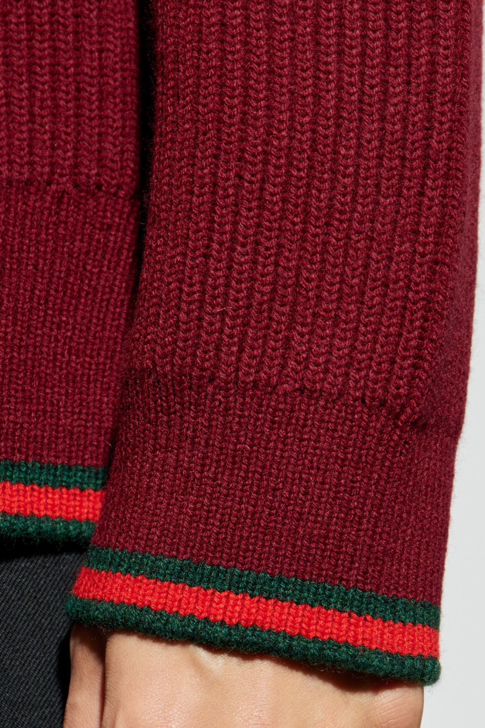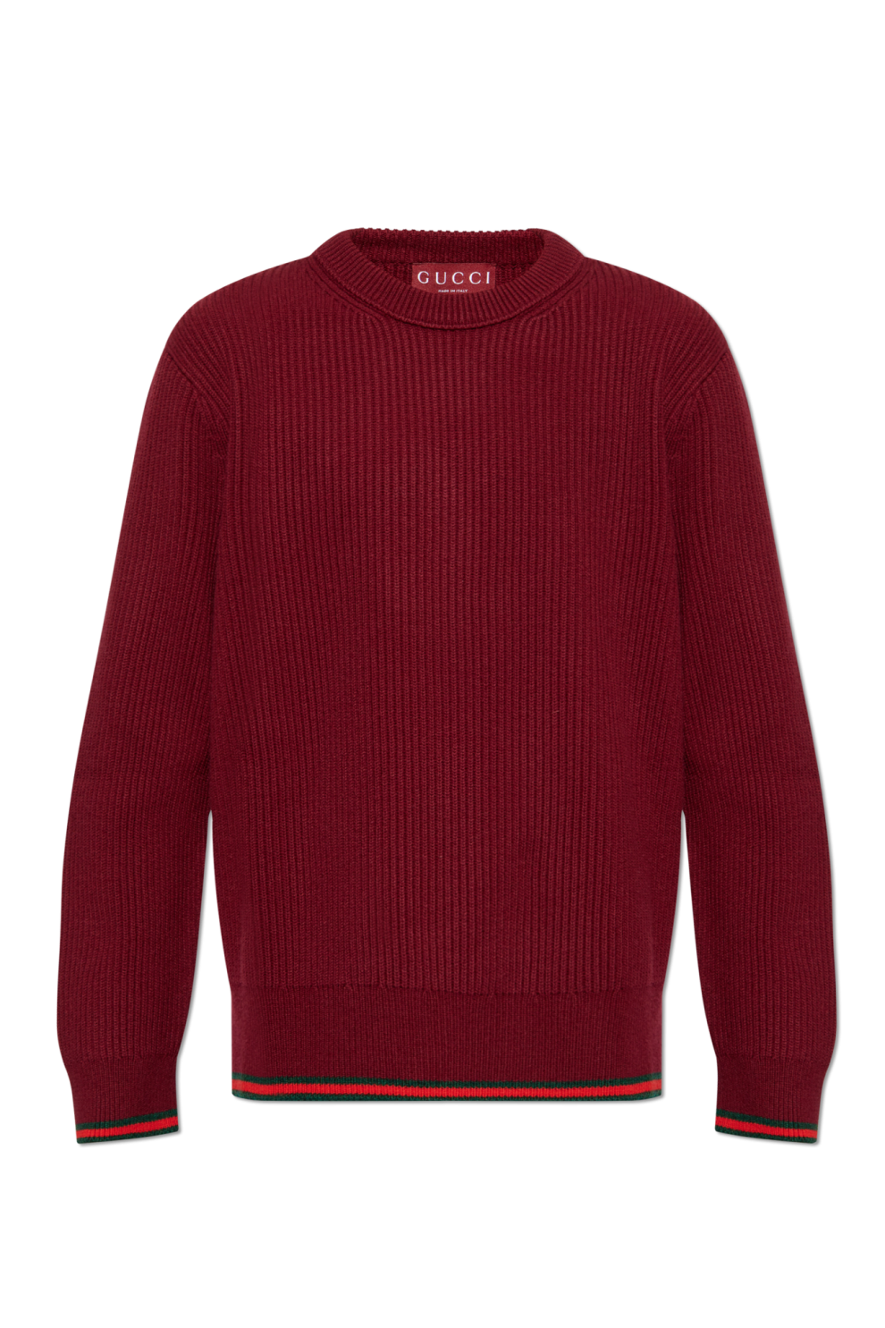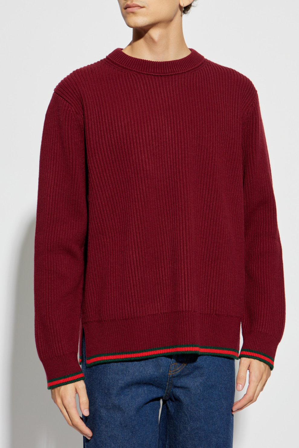 Глубокий бордовый цвет придаёт модели насыщенность и выразительность, а фирменные зелёно-красные полосы на воротнике, манжетах и подоле отсылают к культовым мотивам Дома. Лаконичный крой с длинными рукавами и мягкой фактурой пряжи создаёт образ, в котором сочетаются сила, уверенность и утончённость.