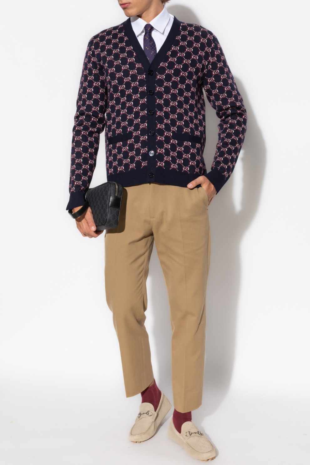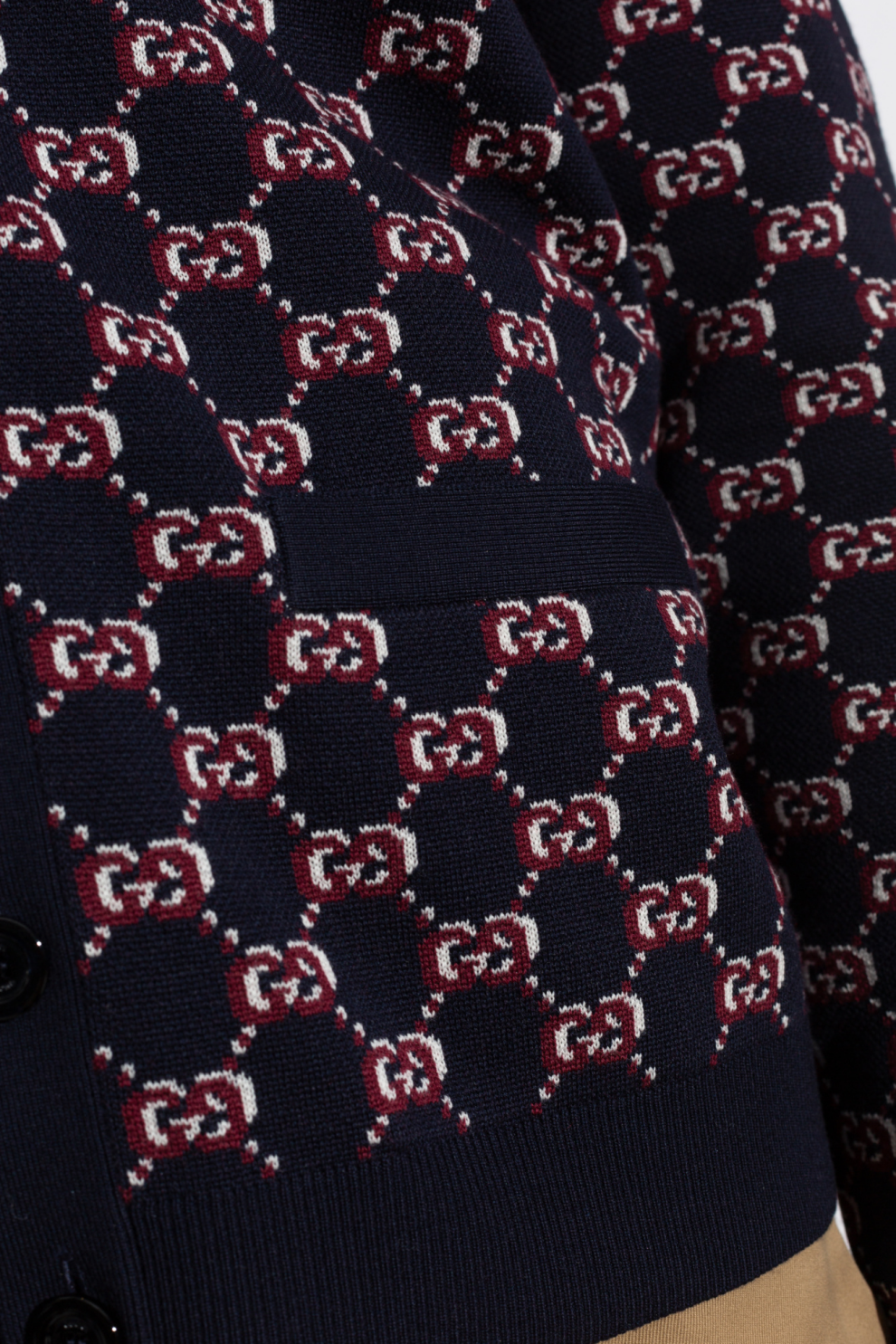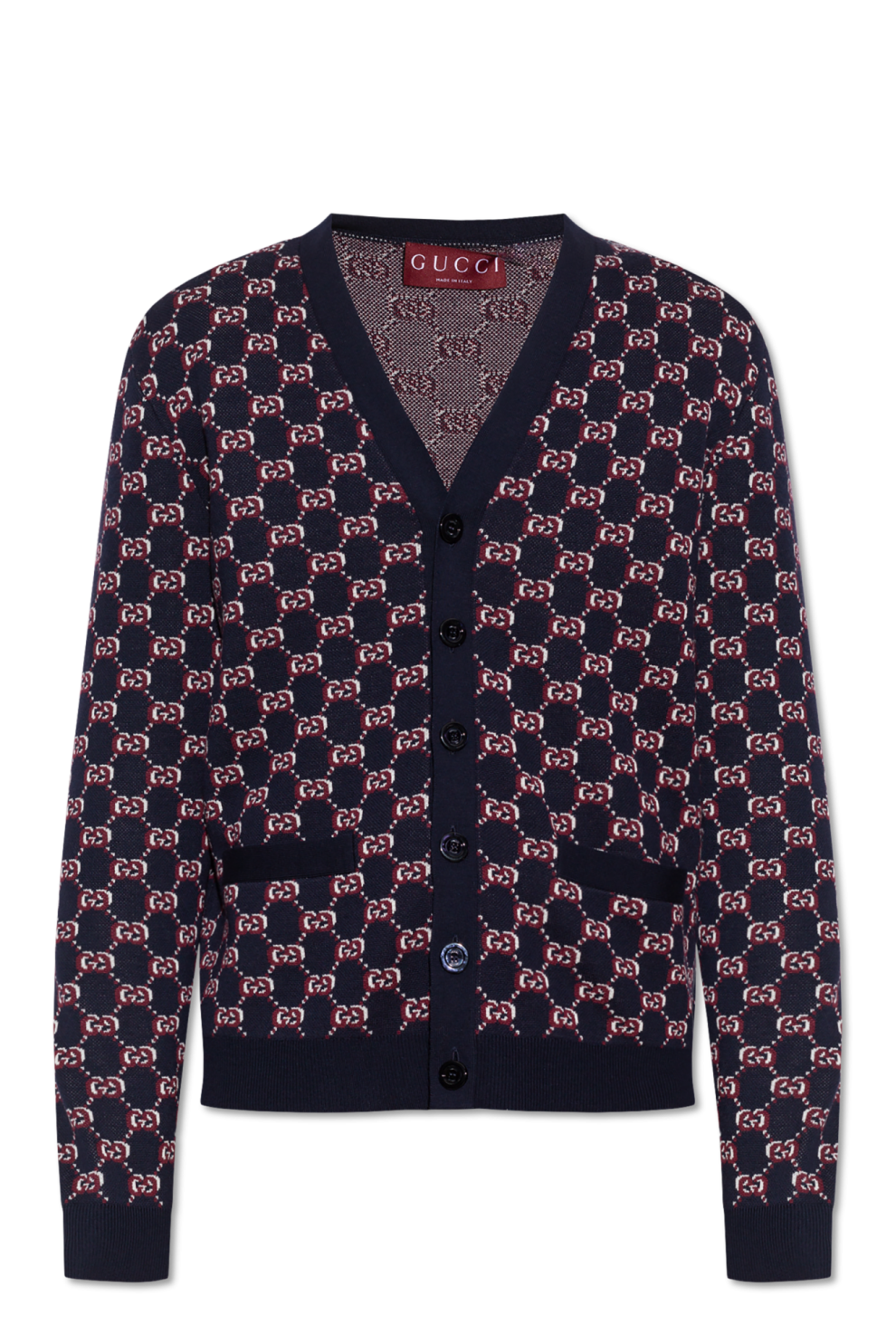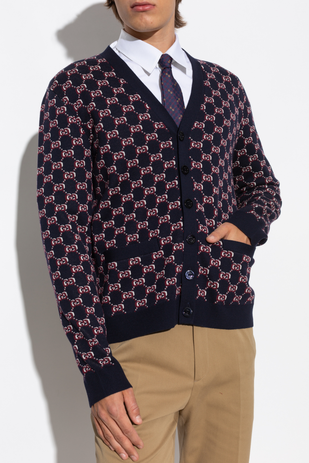 Классический силуэт с V-образным вырезом, длинными рукавами и застёжкой на пуговицы создаёт образ, в котором сдержанность становится символом статуса. Легендарный узор GG, выполненный в тёмно-синей палитре с белыми и красными акцентами, покрывает всё изделие, придавая ему выразительность и неповторимый характер.