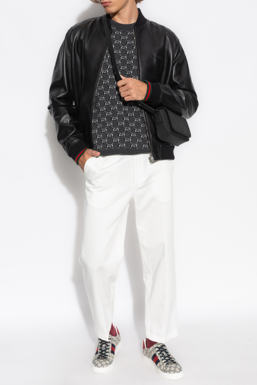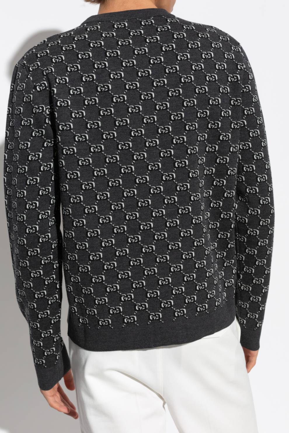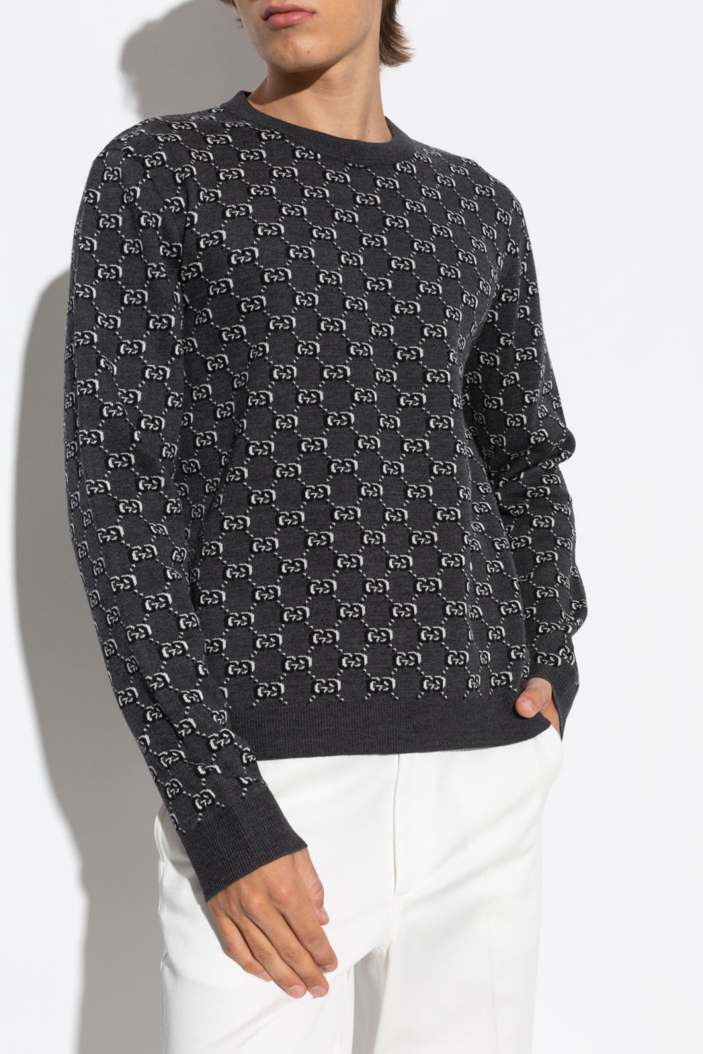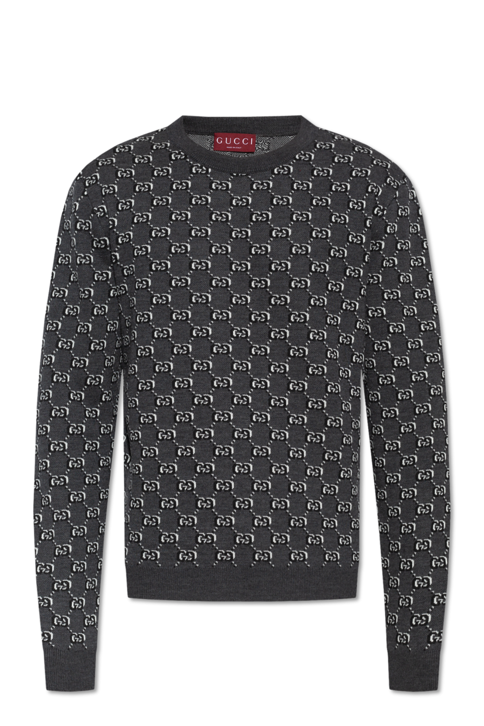 Легендарный узор GG, выполненный в контрастных белых тонах на сером фоне, придаёт изделию глубину и узнаваемость, не нарушая его лаконичную эстетику. Классический прямой силуэт с длинными рукавами, круглым вырезом и ребристой отделкой подчёркивает чистоту линий и безупречный крой, свойственный Дому Gucci.