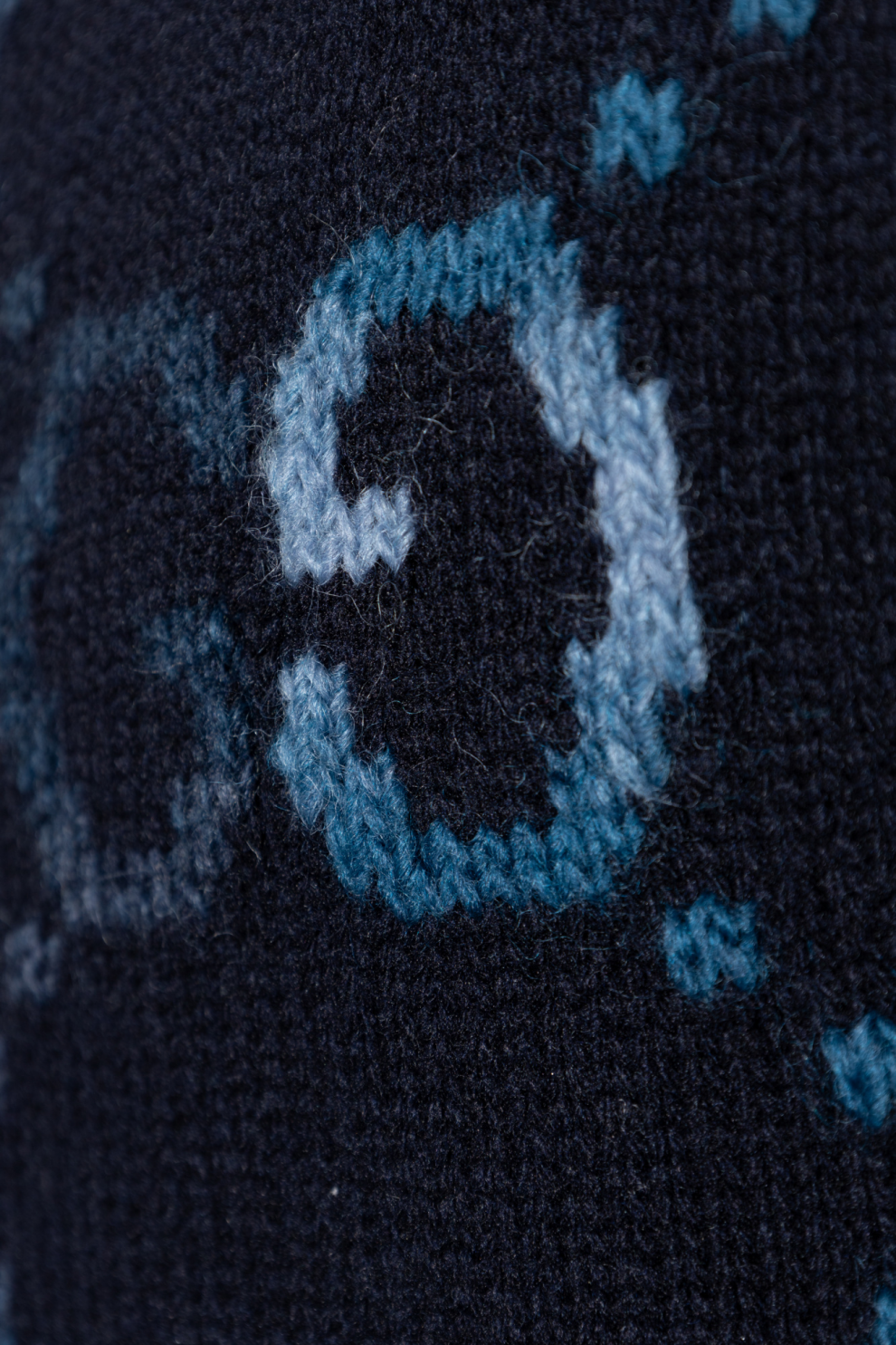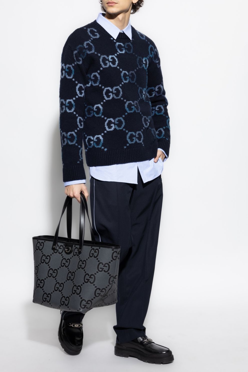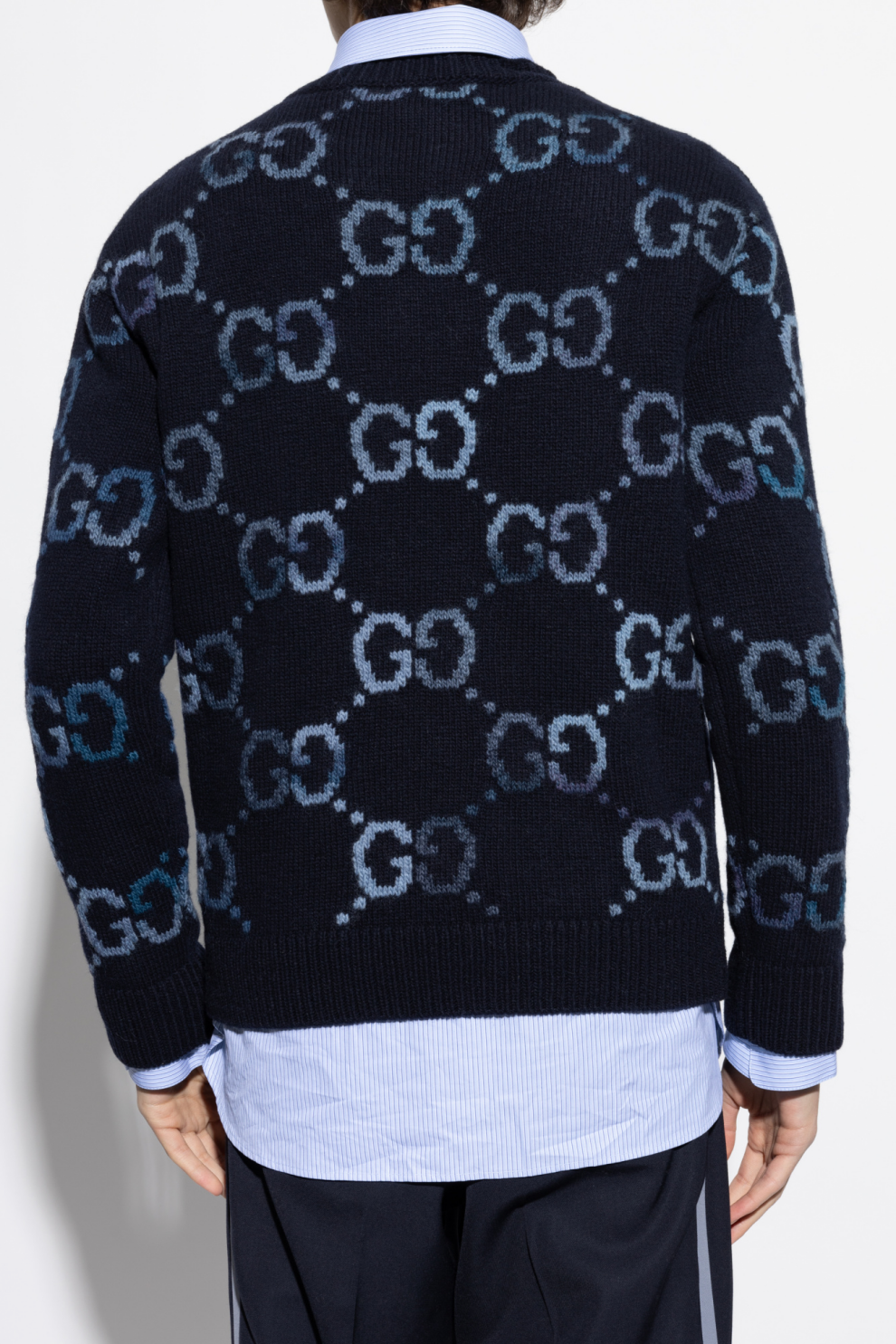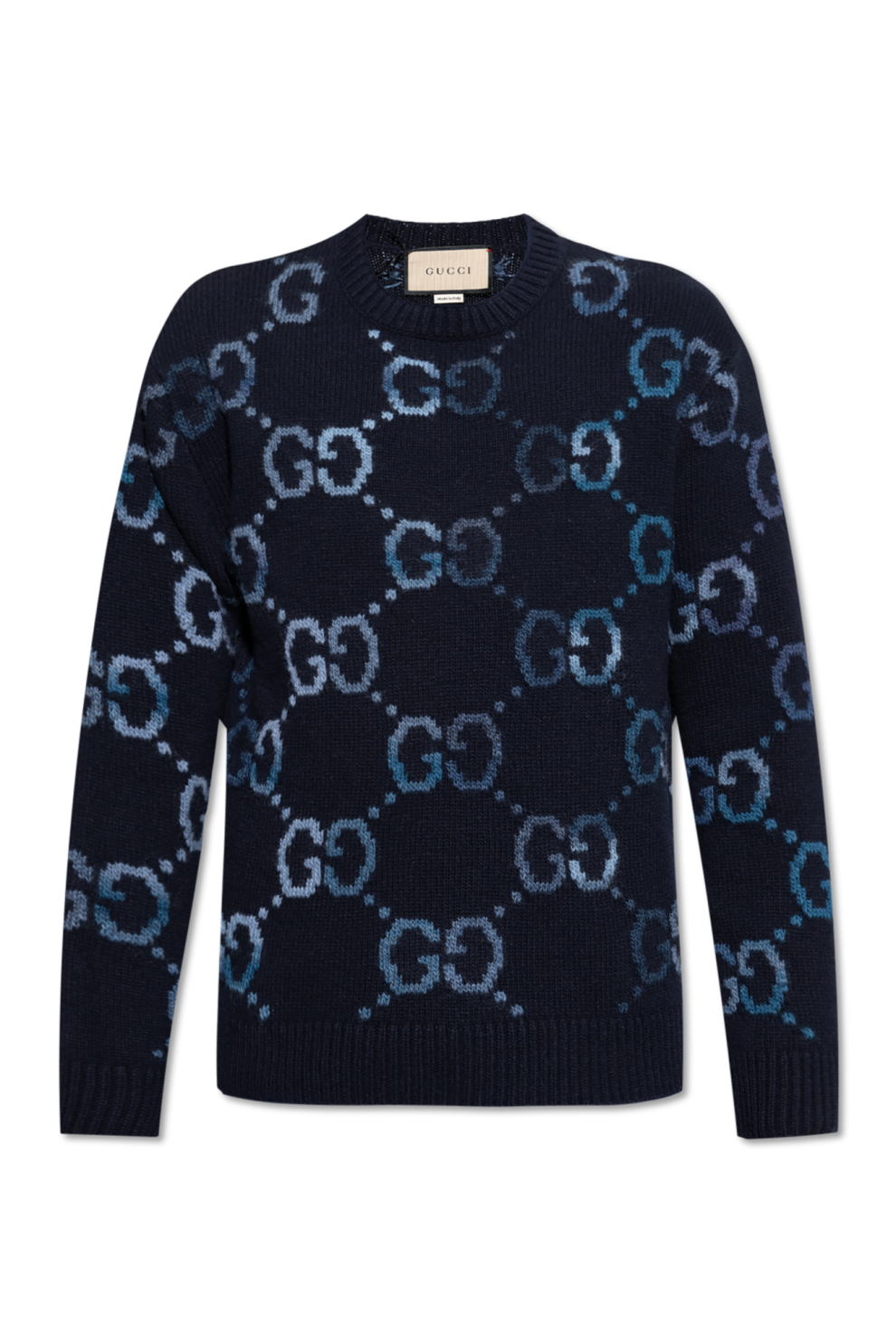 Глубокий тёмно-синий оттенок обогащён фирменным узором GG, выполненным с филигранной точностью и создающим тонкий визуальный ритм. Классический прямой крой, длинные рукава и круглый вырез делают модель универсальной и неподвластной времени, а деликатная текстура трикотажа подчеркивает качество и мастерство исполнения.