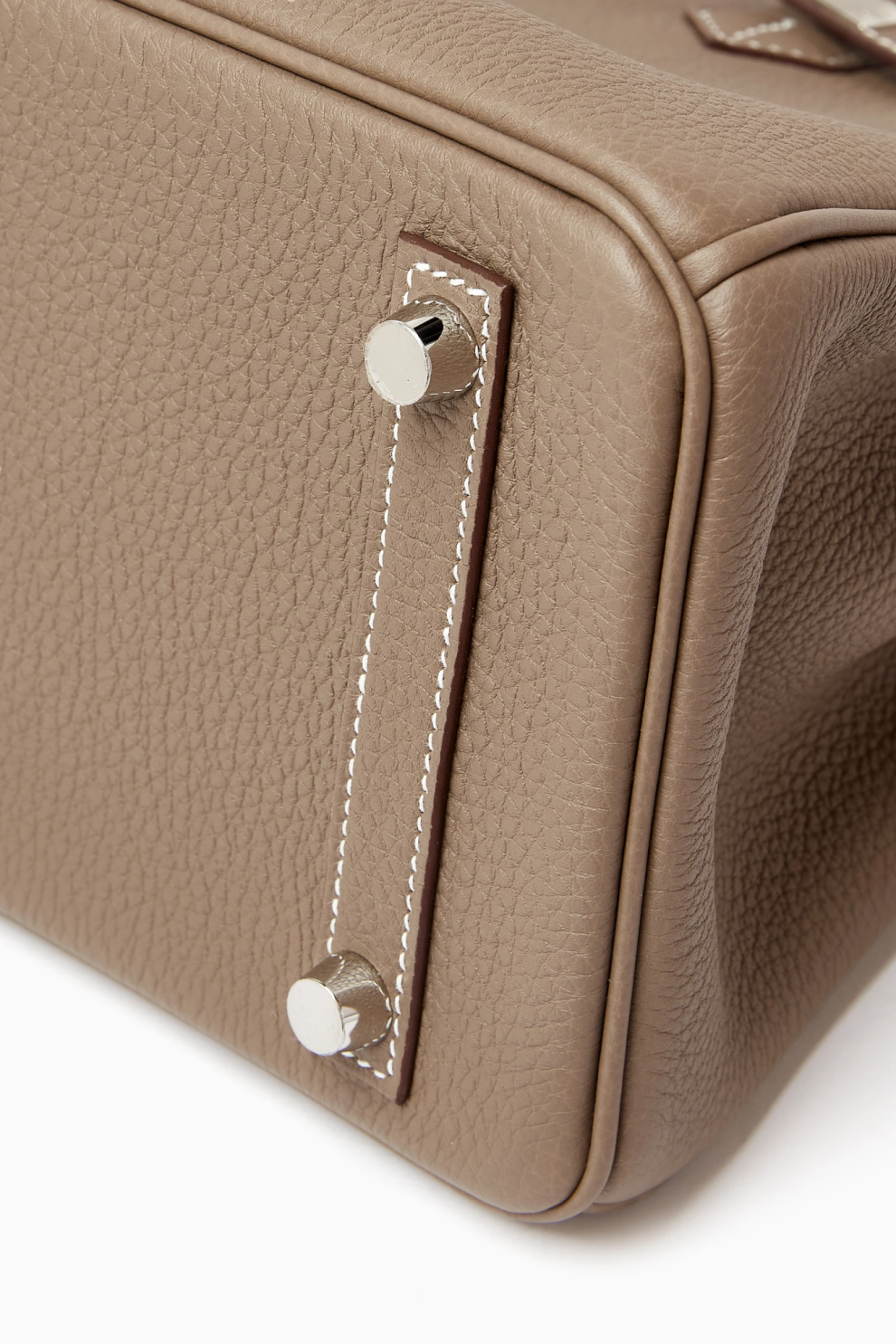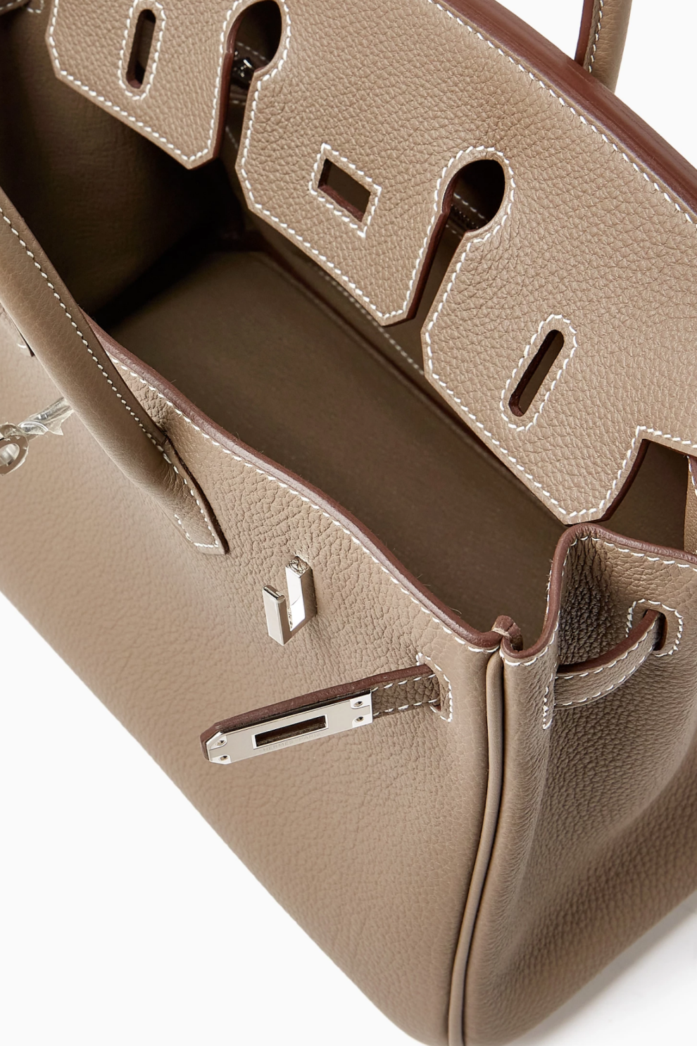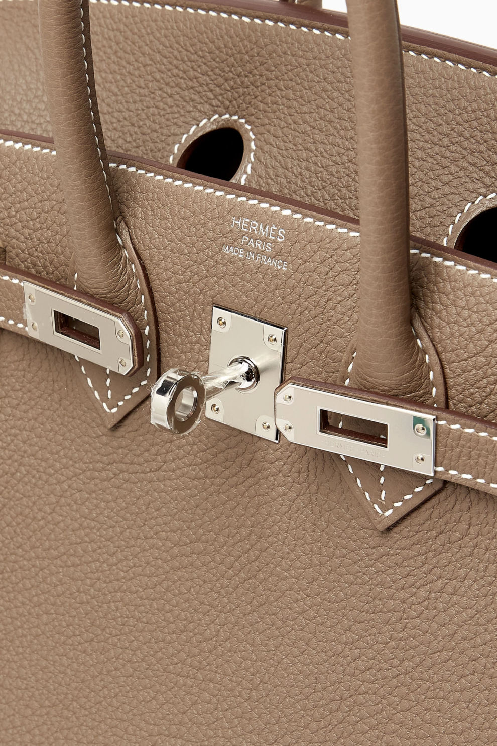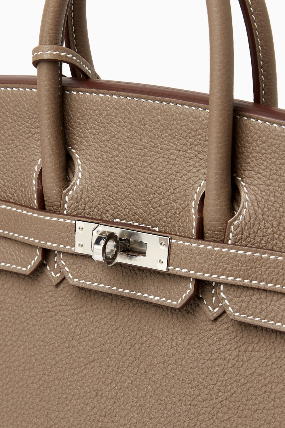 Фурнитура с палладиевым покрытием (Palladium Hardware, PHW) придаёт изделию современный и сдержанный блеск, элегантно контрастируя с нейтральной глубиной оттенка Etoupe. Знаковая конструкция Birkin с характерным клапаном и ремешками остаётся символом безупречного мастерства и вневременного стиля.