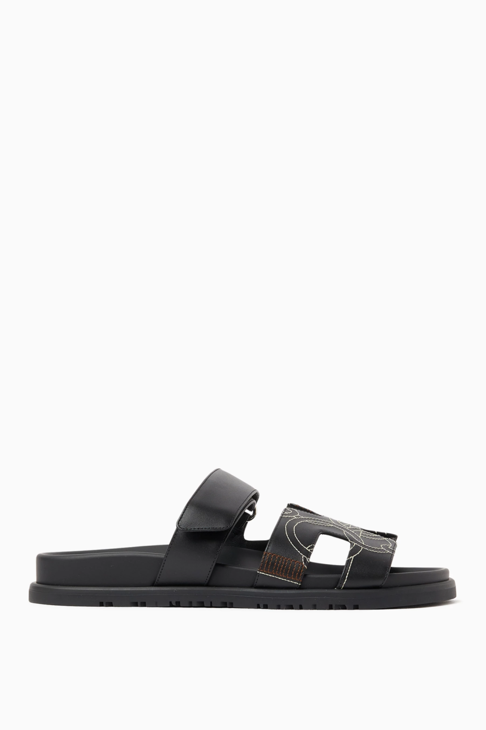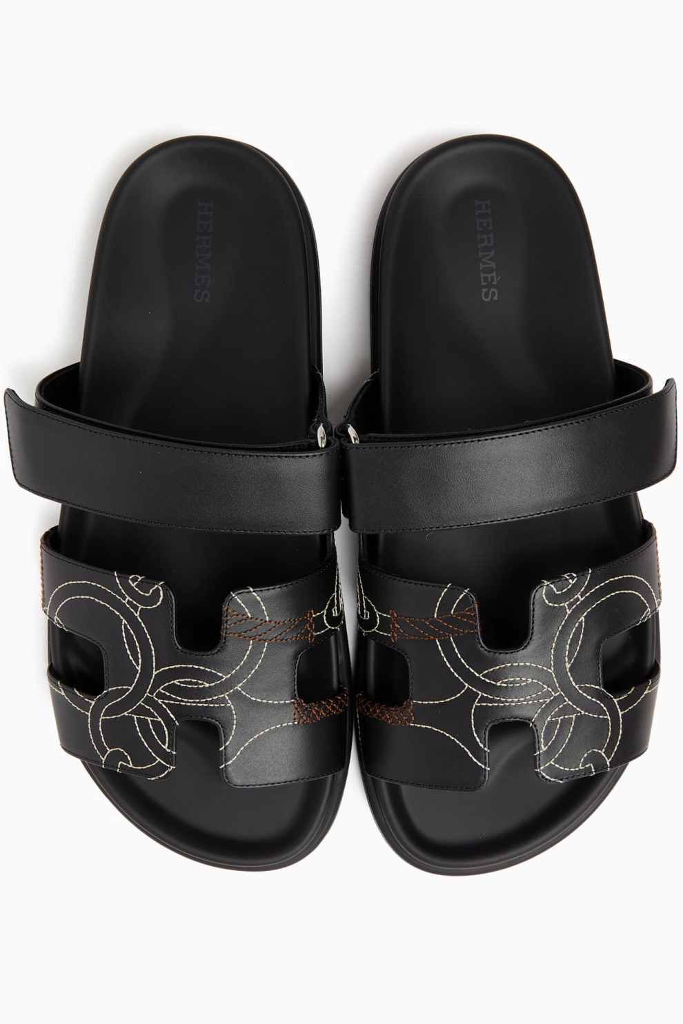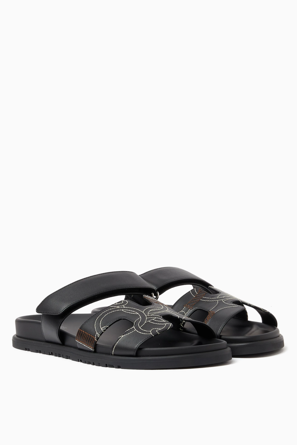 Сандалии Chypre от Hermès — один из самых желанных аксессуаров для повседневного образа круглый год. Модель выполнена из высококачественной кожи с гладким верхом классического черного цвета, украшенного вышивкой Panoplie Equestre, что добавляет образу особой выразительности.