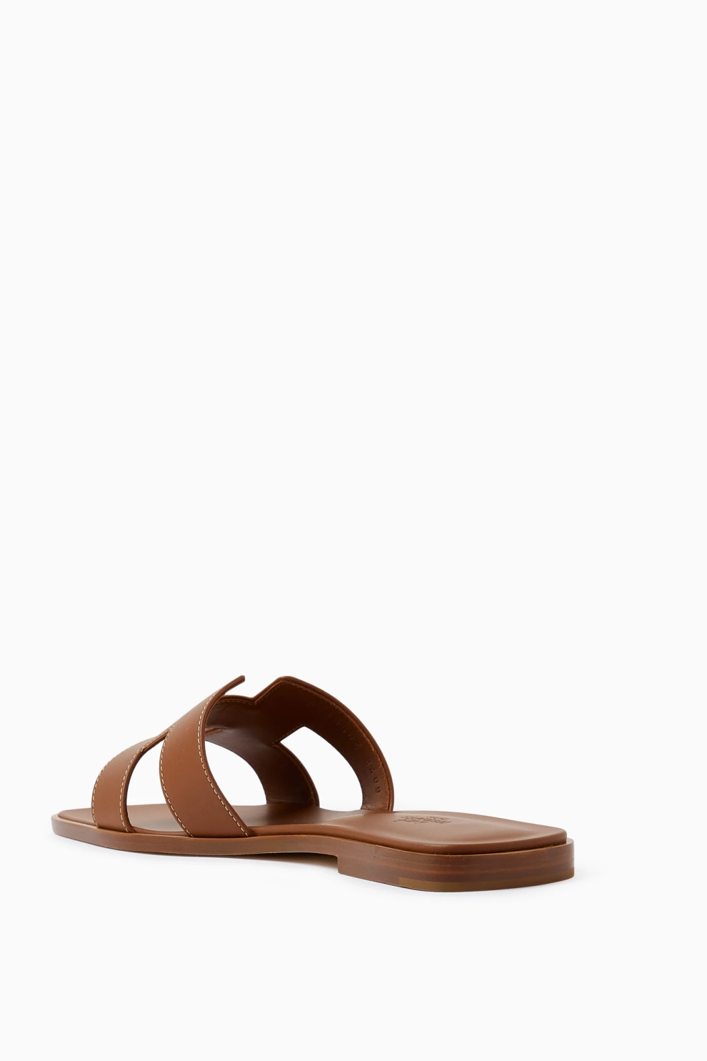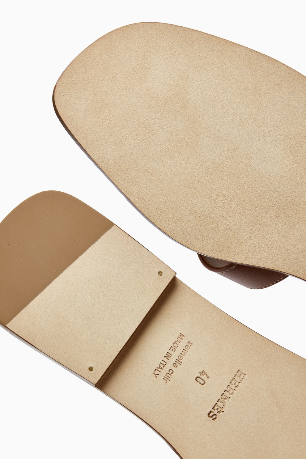 Лаконичный силуэт в классическом коричневом цвете, который придает вневременной элегантности любому образу. Изготовленные из высококачественной кожи, они отличаются изысканной фактурой и деликатным блеском. Знаковая перемычка с вырезом в форме буквы H — фирменный код Hermès — не только формирует узнаваемый дизайн, но и обеспечивает надежную фиксацию стопы.
