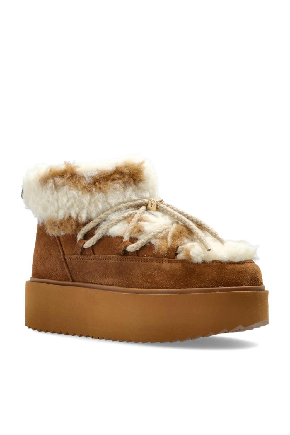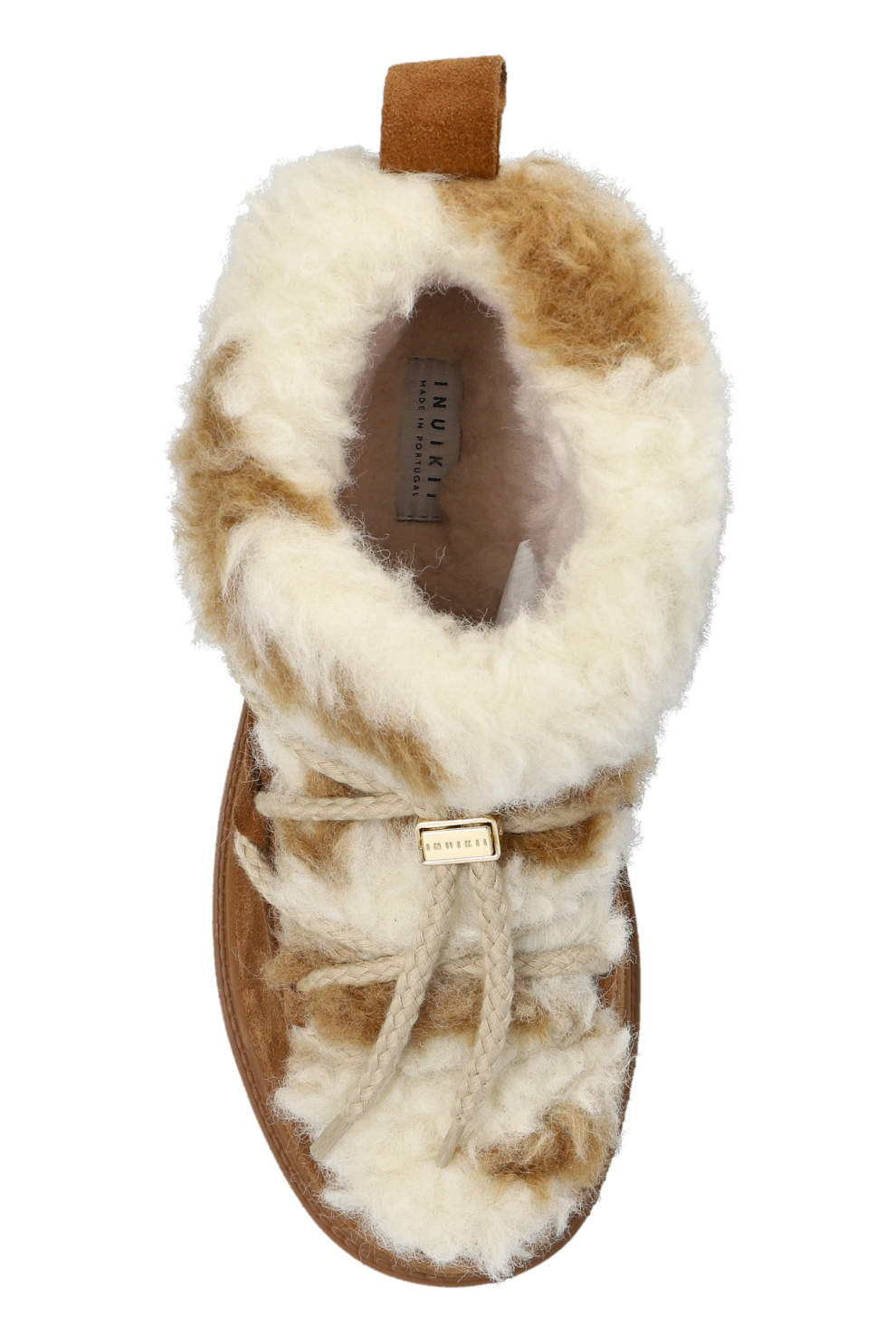 Верх выполнен из мягкой коричневой замши и дополнен контрастной меховой отделкой кремово-белого оттенка, которая эффектно обрамляет щиколотку и придаёт образу ощущение уюта и эксклюзивности. Внутренняя меховая подкладка обеспечивает тепло и комфорт в холодную погоду.