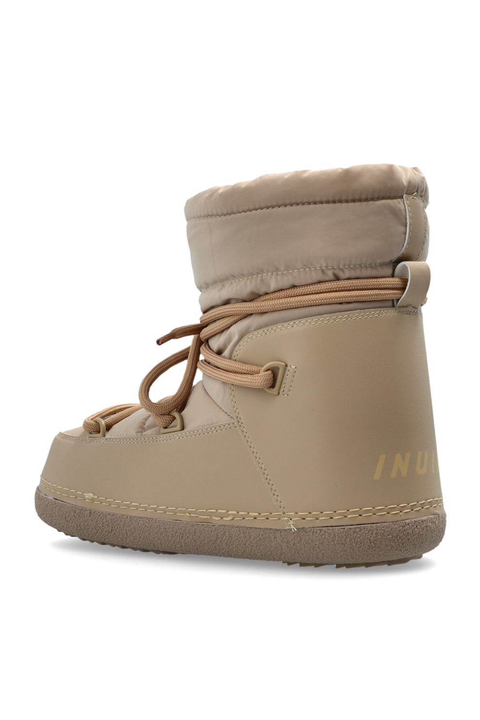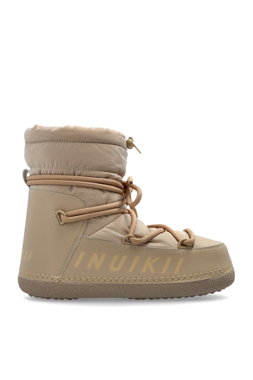 Верх объединяет синтетическую или искусственную кожу с стёганой текстильной отделкой, обеспечивая тепло и защиту от холода. Оригинальная шнуровка по всей стопе позволяет точно зафиксировать посадку, а контрастный логотип INUIKII сбоку добавляет деликатный фирменный акцент.