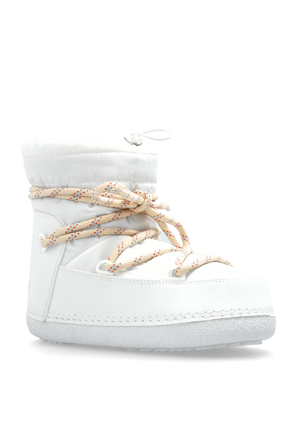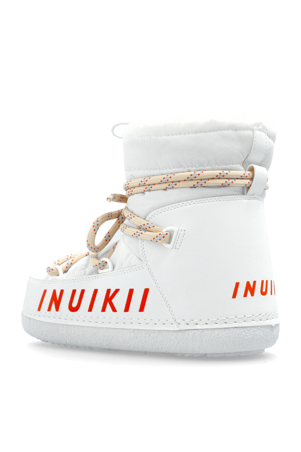 Изготовленные из гладкого, высококачественного материала, эти зимние ботинки очаровывают своей идеально белой отделкой, подчеркнутой едва заметными строчками, демонстрирующими прочность и внимание к деталям. Яркие белые шнурки с оранжевыми акцентами, переплетенные с широкими петлями ткани, являются уникальным декоративным элементом, добавляющим оригинальности и характера общему дизайну.