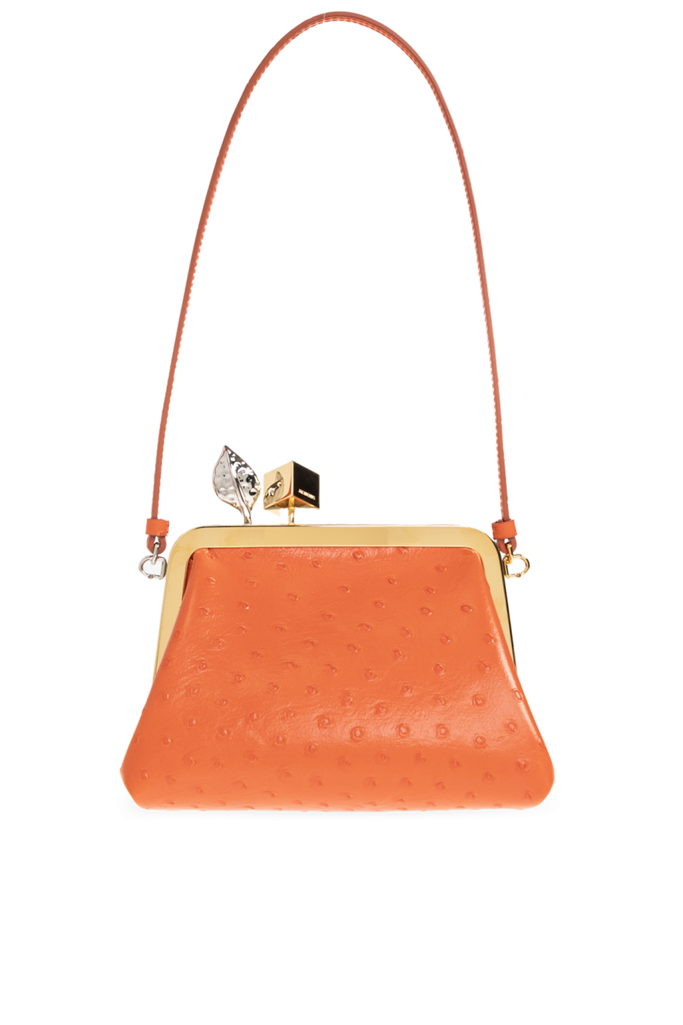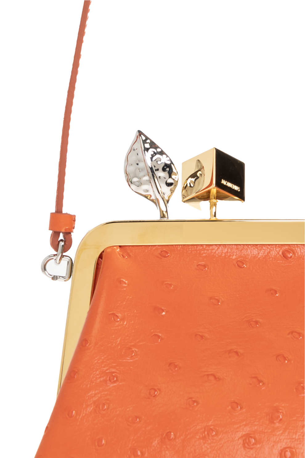Фирменная застёжка-каре сочетает элементы из золотистого и серебристого металла — кубическую форму и деталь с листовидным, кристаллизованным эффектом. Контрастные металлические акценты и тонкий съёмный плечевой ремень завершают образ, подчёркивая внимание Jacquemus к деталям и пропорциям.