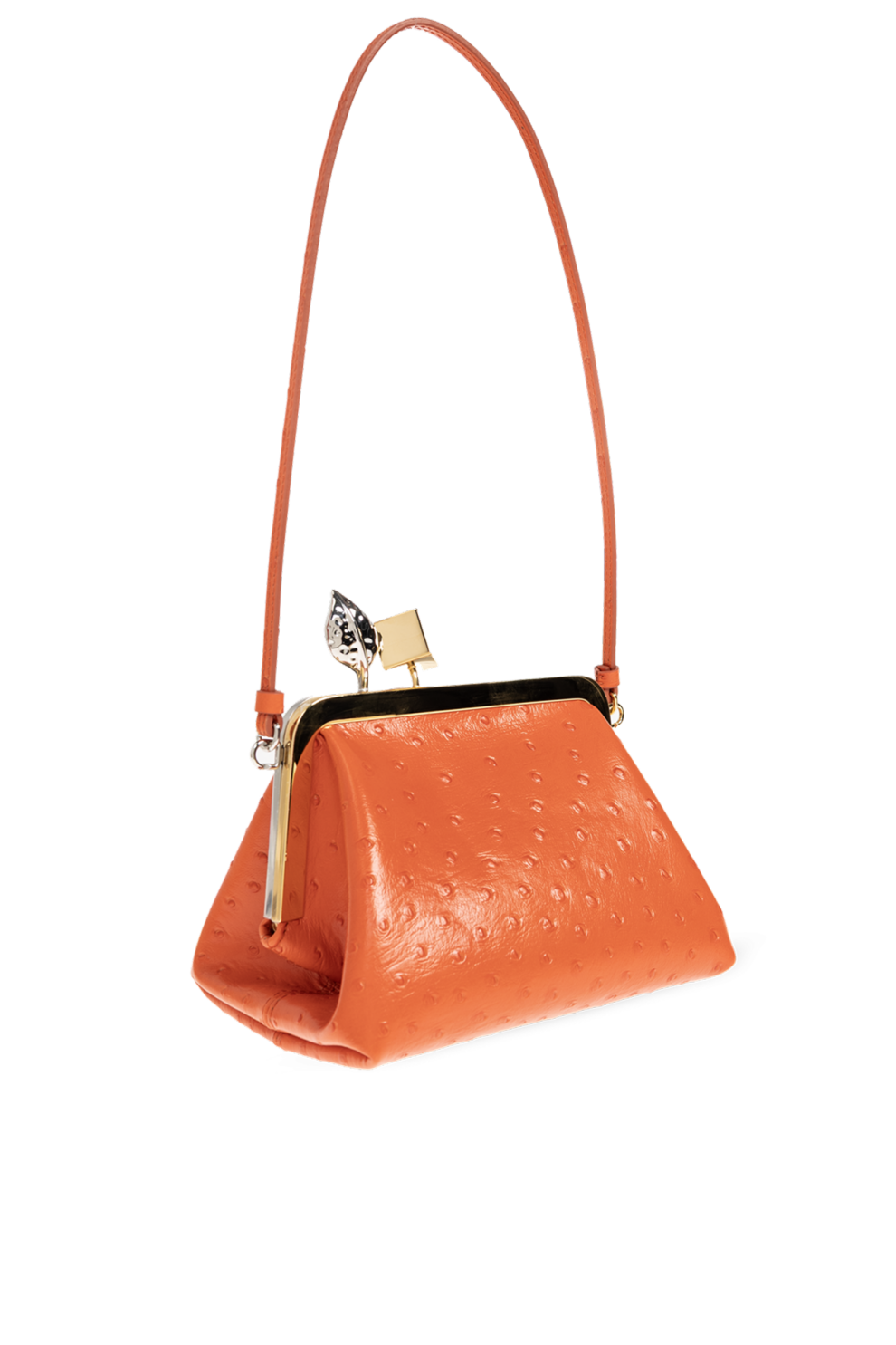 Верх выполнен из гладкой кожи с тиснением под страуса, придающим поверхности богатую текстуру и визуальную глубину. Насыщенный оранжевый оттенок добавляет образу свежий акцент и делает сумку эффектным элементом весенне-летнего гардероба.