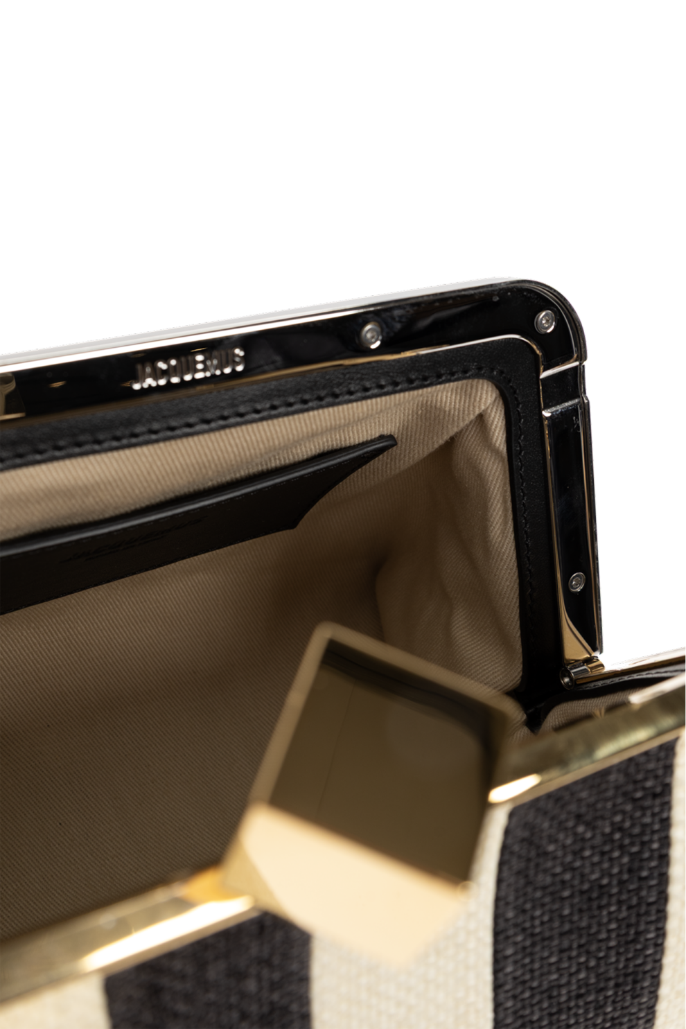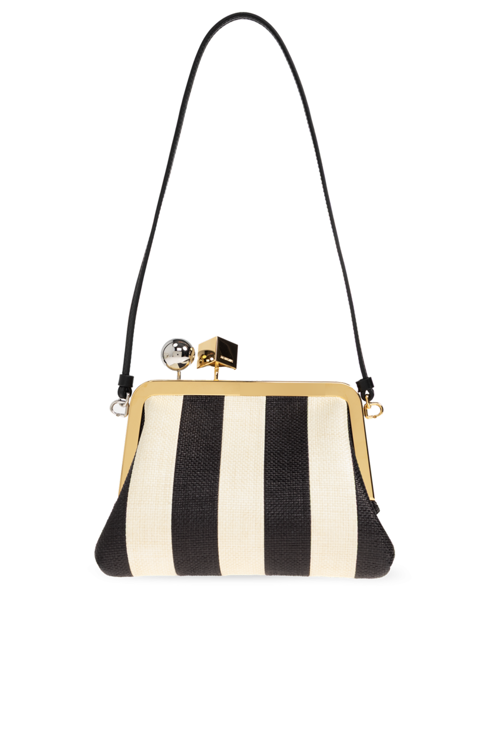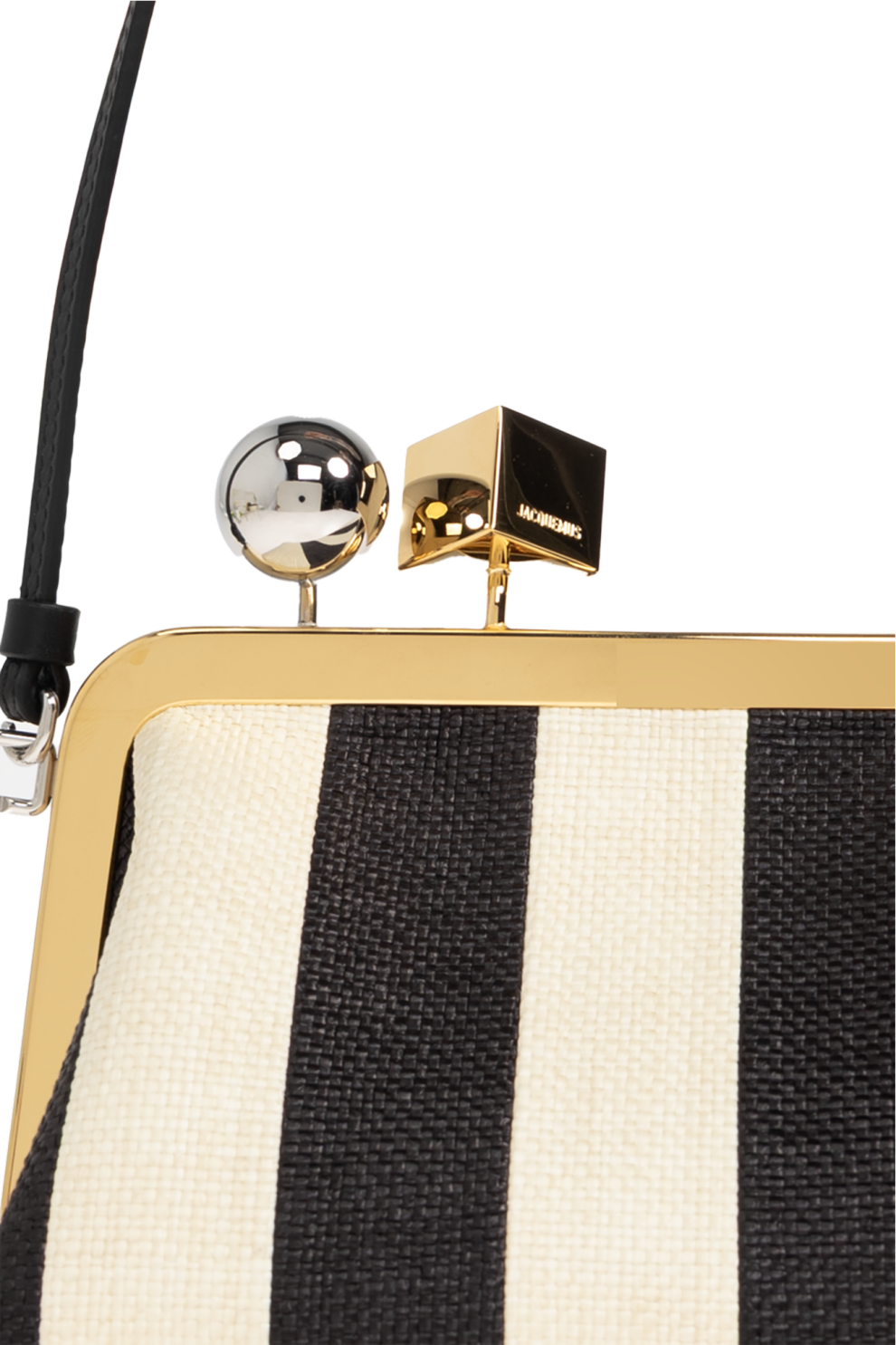 Фирменная застёжка-каре — сочетание золотого куба и серебристого шарика — заключена в золотистую рамку и дополнена логотипом дизайнера, подчёркивая узнаваемый стиль Jacquemus и внимание к деталям.