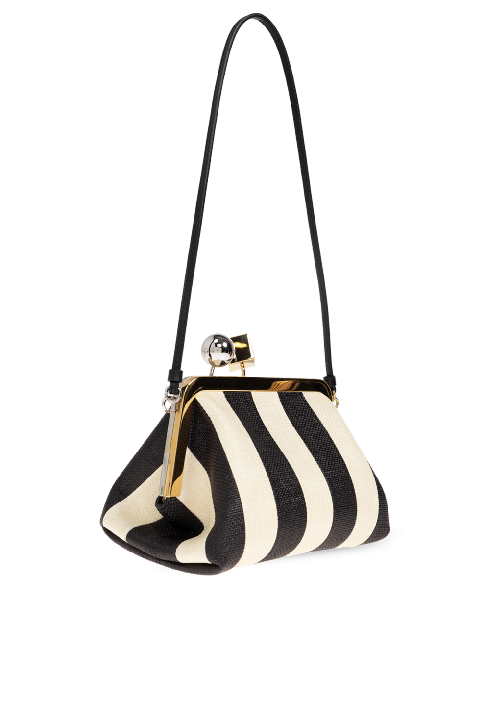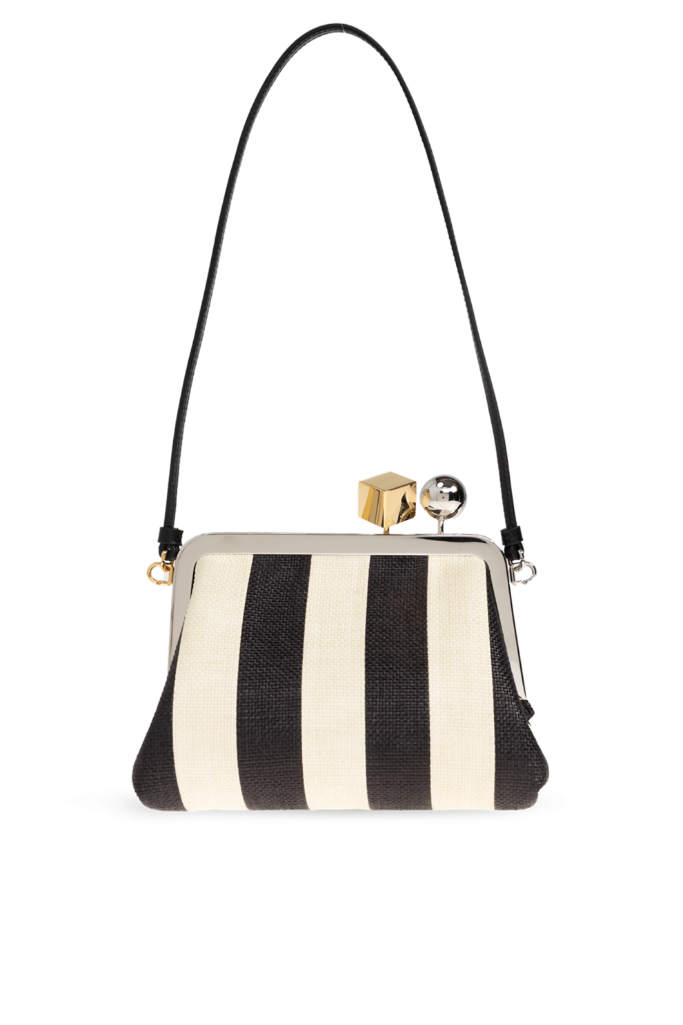 Модель выполнена из фактурного полиамида с эффектом рафии и дополнена кожаной и металлической отделкой. Контрастные вертикальные полосы чёрного и кремового оттенков усиливают визуальную динамику и делают сумку ярким акцентом в образе.