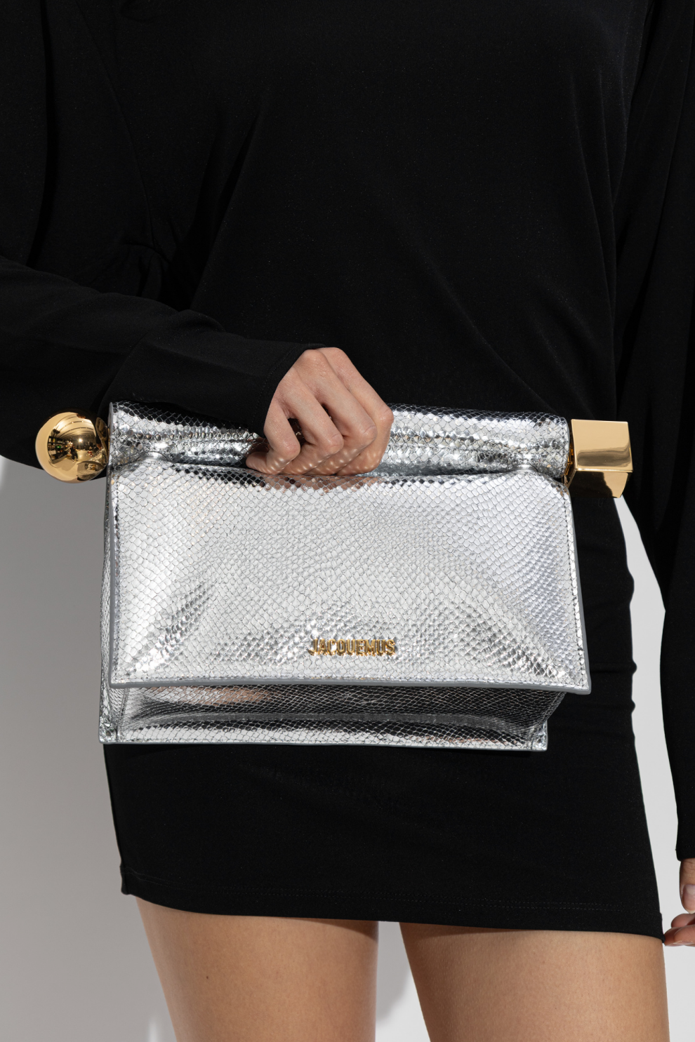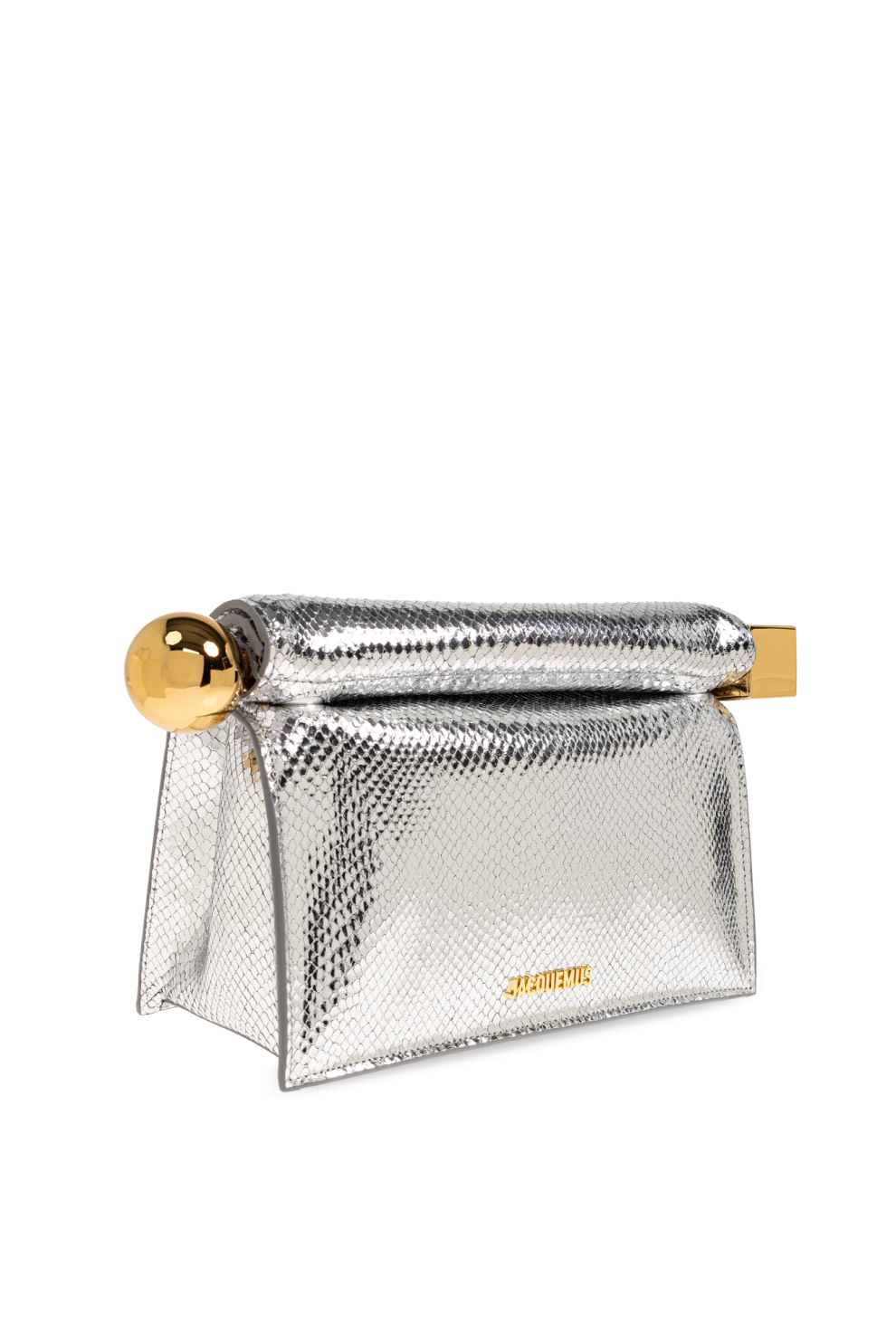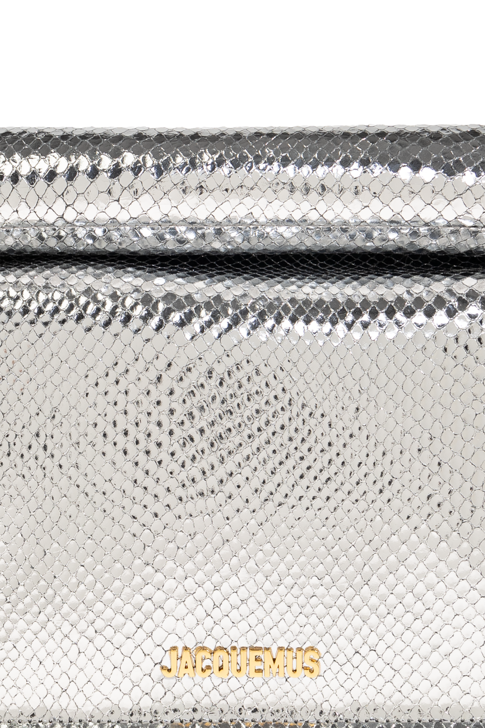 Сумка La Pochette Rond от Jacquemus — это яркий пример современной изысканности. Ее прямоугольная, слегка выпуклая форма подчёркивает геометрическую строгость, а блестящая серебристая лакированная поверхность с имитацией змеиной кожи добавляет загадочный и роскошный характер под особые случаи.