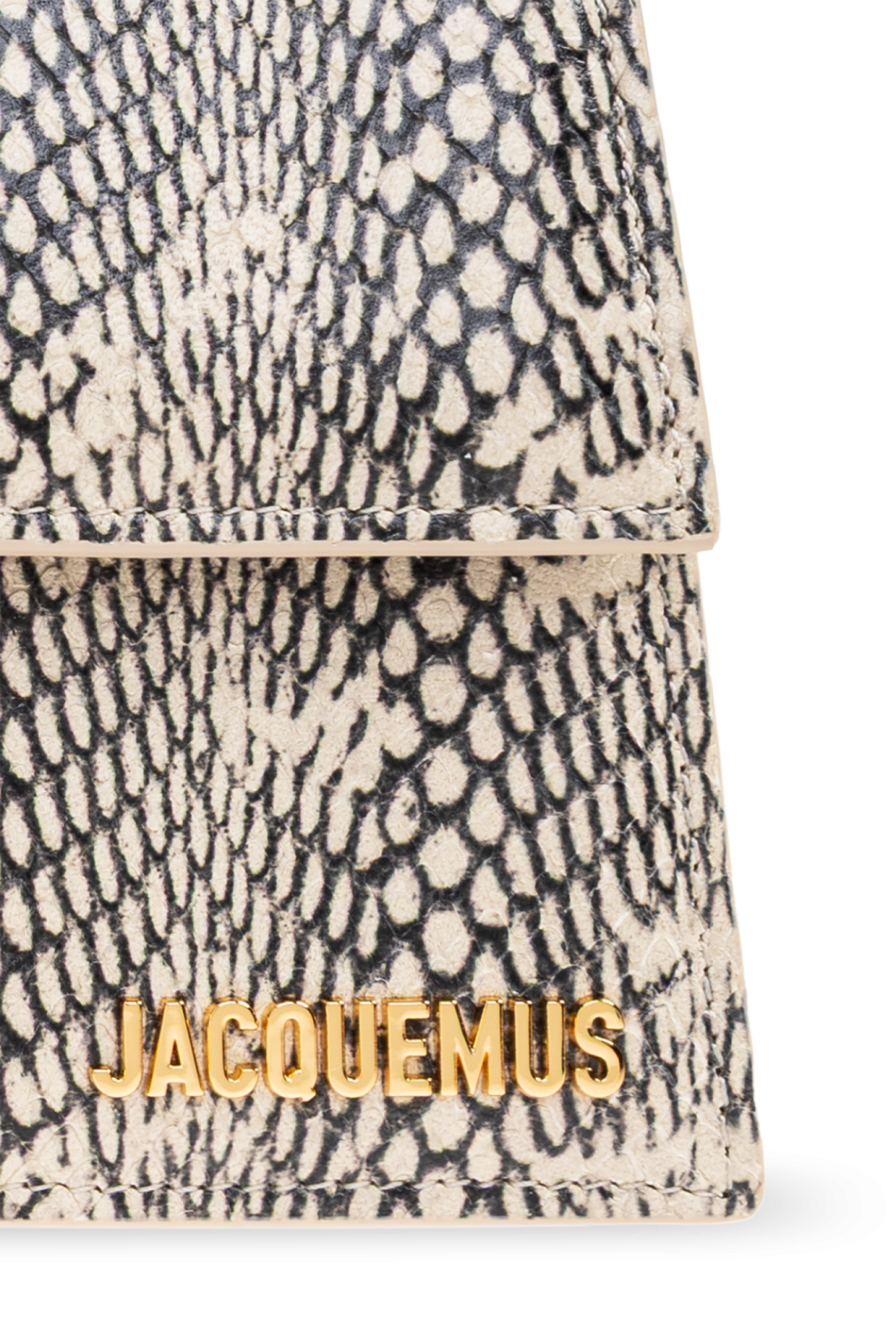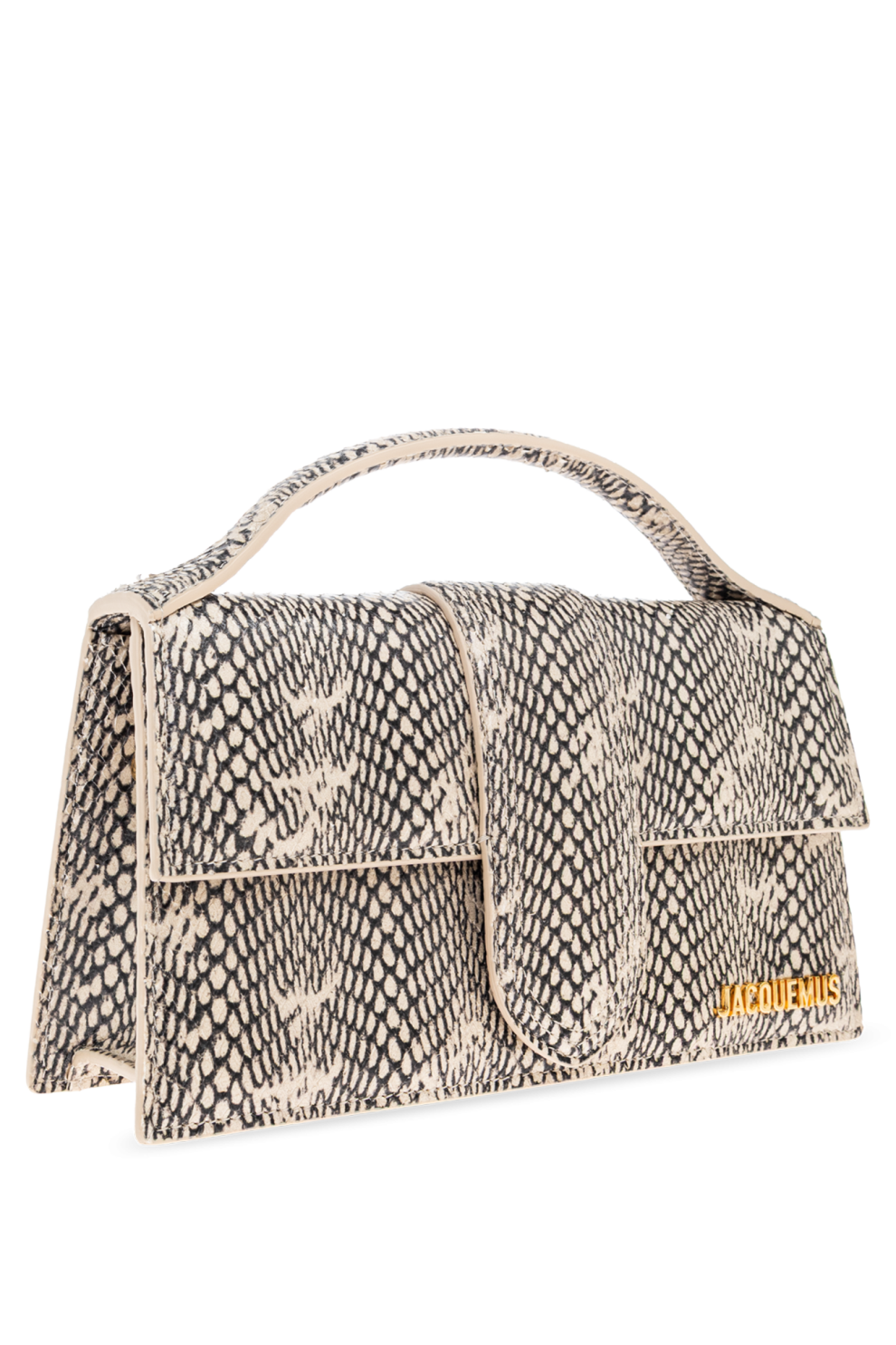 Выполненная в кремовых тонах с искусным тиснением под кожу питона, она идеально отражает современный дух французской моды. Уникальная форма с короткой жёсткой ручкой обеспечивает исключительный комфорт при переноске и подчёркивает её эксклюзивный характер. Внешняя часть выполнена из высококачественной телячьей кожи, обеспечивающей прочность и лёгкий блеск, а внутренняя — из мягкого, лёгкого, устойчиво к пятнам хлопка. Эффектный золотой логотип на переднем клапане символизирует искусное мастерство и уникальный стиль известного дизайнера Симона Порта Жакмюса.