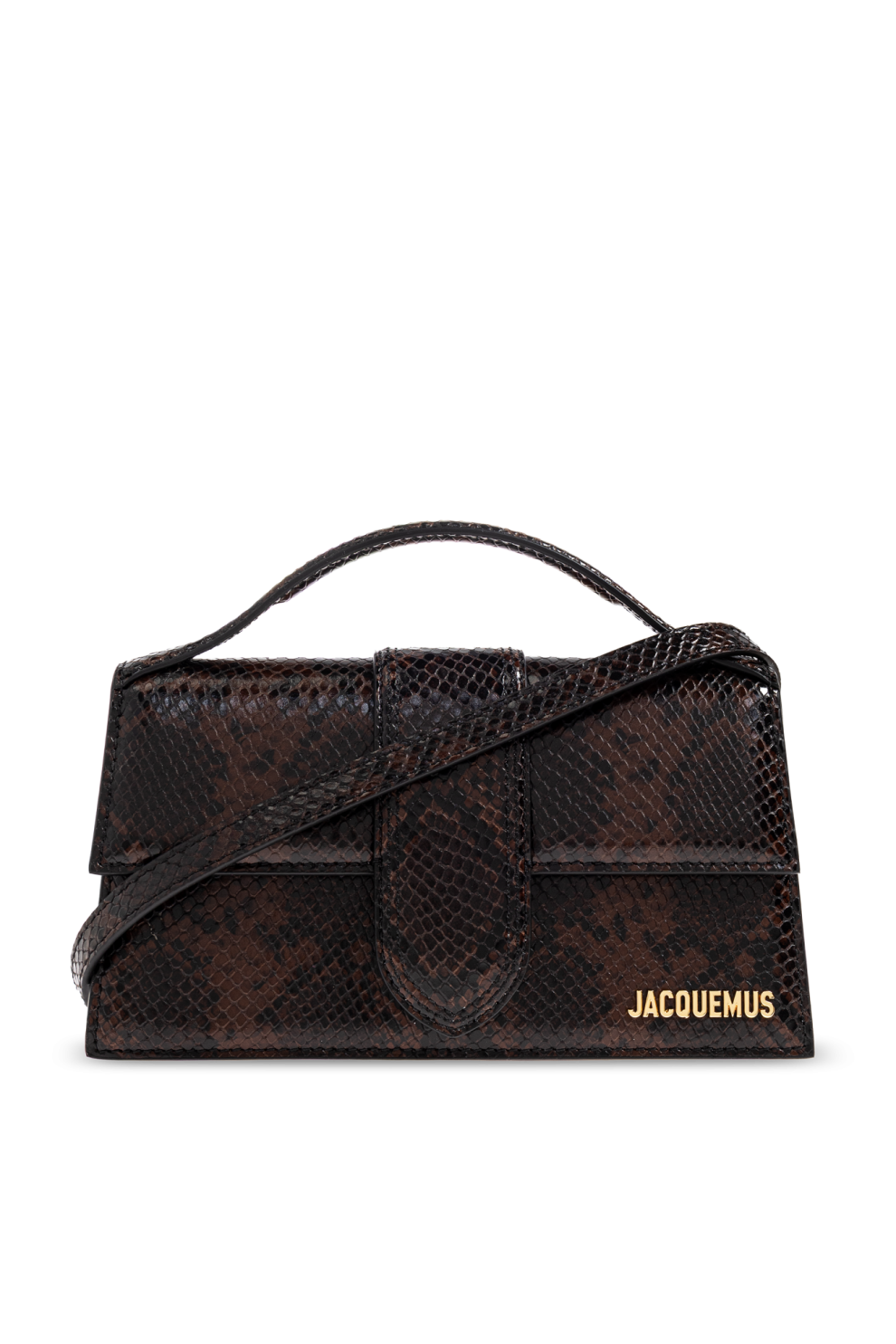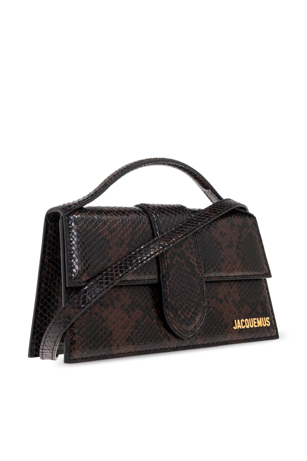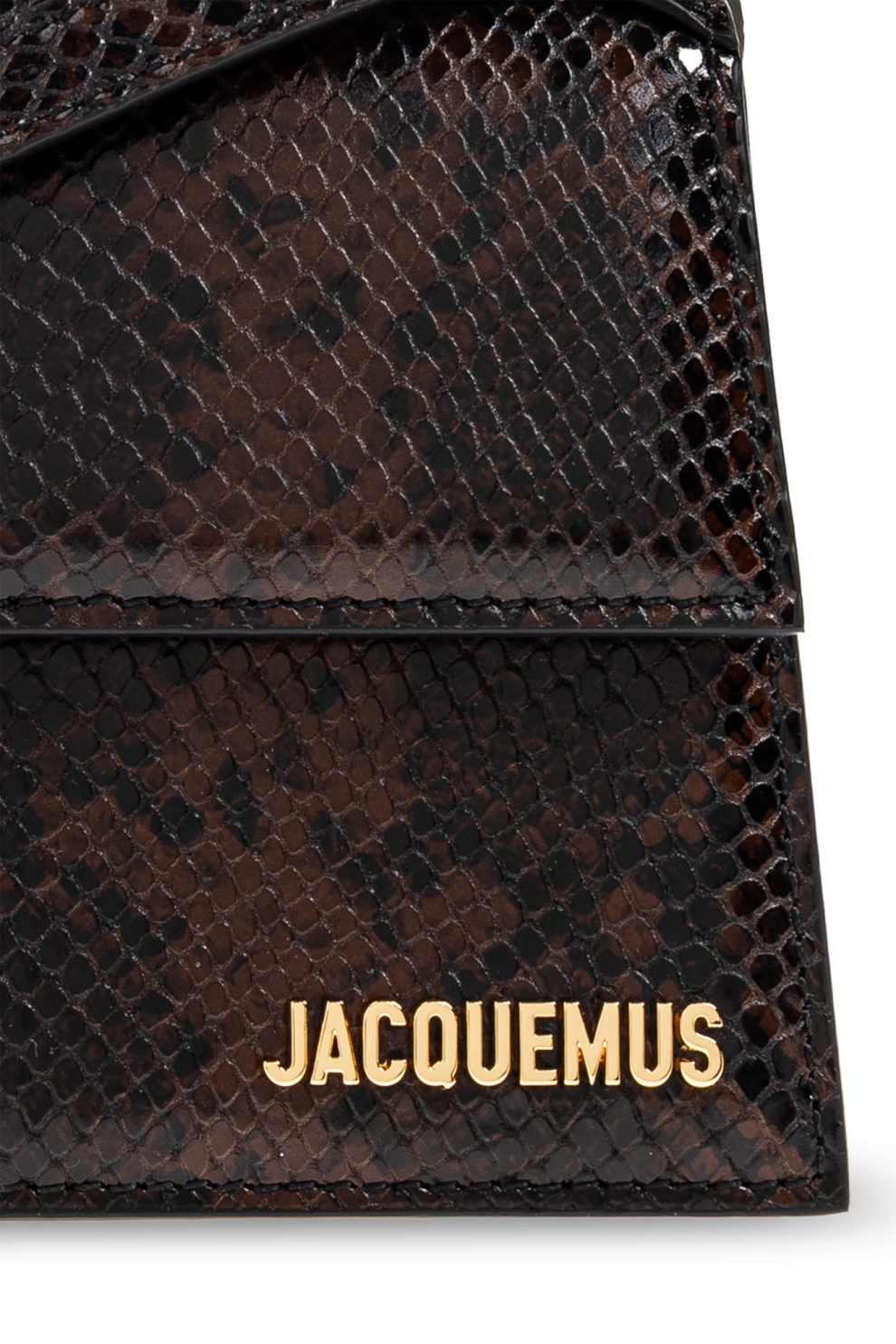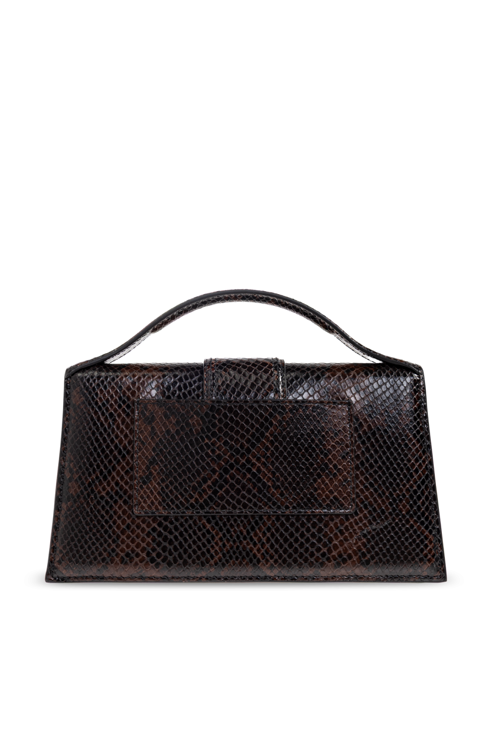 Строгий прямоугольный силуэт подкупает чистотой геометрических линий, а оригинальный клапан и полукруглая ручка подчёркивают её современный характер. Роскошная поверхность, имитирующая змеиную кожу, в насыщенном коричневом оттенке завораживает тонкими цветовыми переходами и рельефной фактурой, придавая сумке неповторимый характер. Дополнительным акцентом сумки является золотистый металлический логотип, сдержанно расположенный в углу и идеально контрастирующий с текстурой кожи.