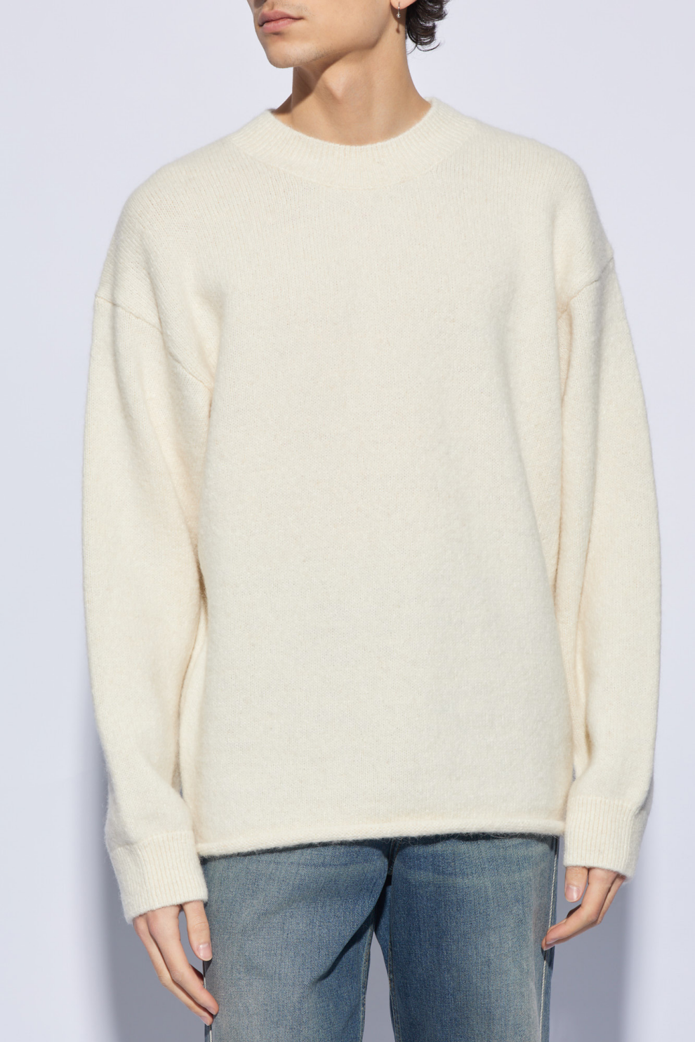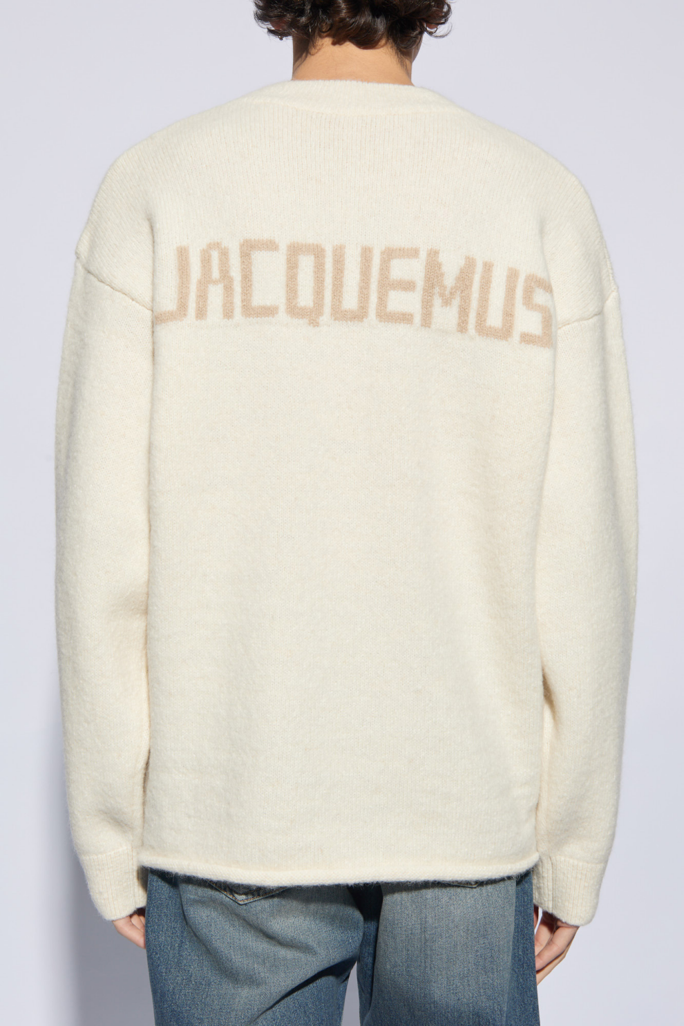 Элегантный силуэт с круглым вырезом и слегка спущенной линией плеч создаёт расслабленную, но безупречно стильную посадку. Длинные рукава и аккуратный крой подчёркивают утончённость деталей, а крупная надпись «JACQUEMUS» на спине превращает свитер в выразительный арт-объект, который одновременно чтит наследие бренда и демонстрирует современное модное видение.