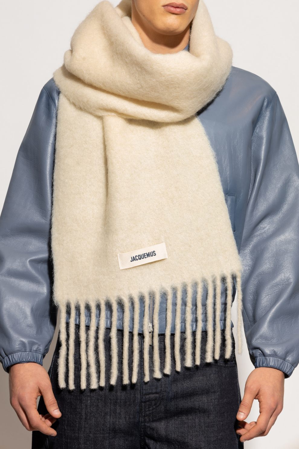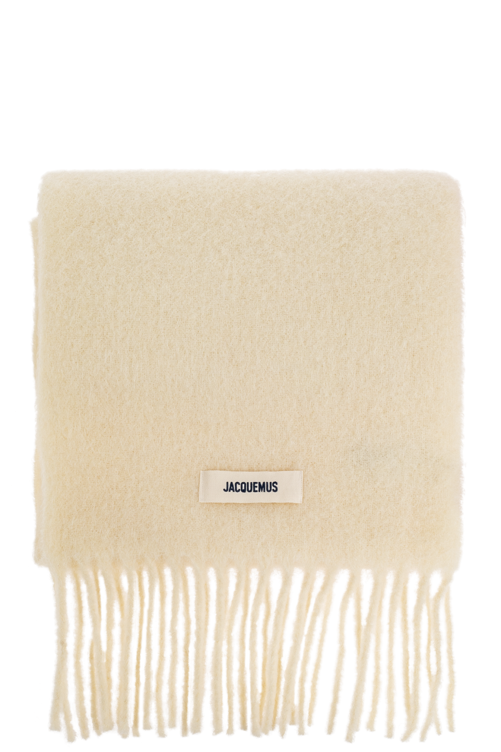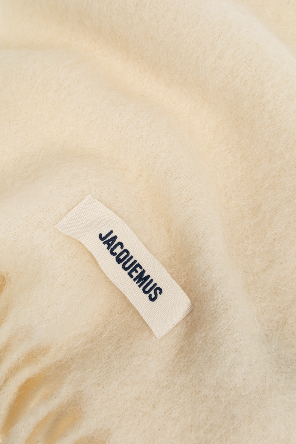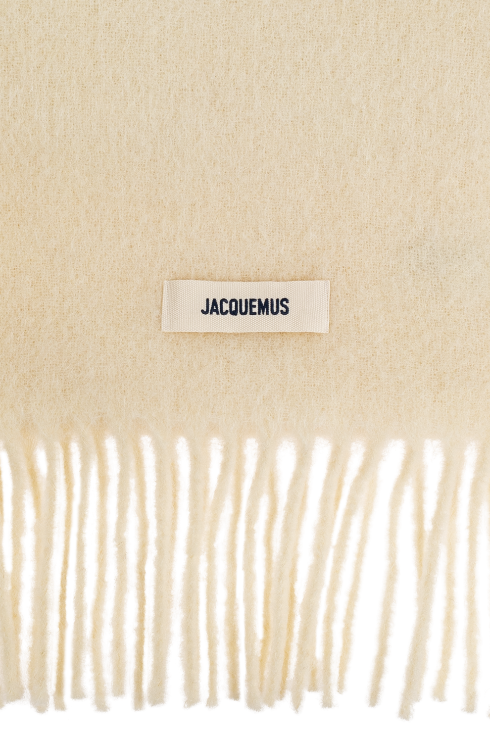 Пушистая фактура волокон создаёт живую, тактильно богатую поверхность, а контрастная бахрома на концах придаёт аксессуару лёгкое движение и непринуждённый шарм. Белая нашивка с крупной надписью JACQUEMUS завершает композицию, добавляя современный акцент брендинга, характерный для эстетики Симона Порт Жакмюса.