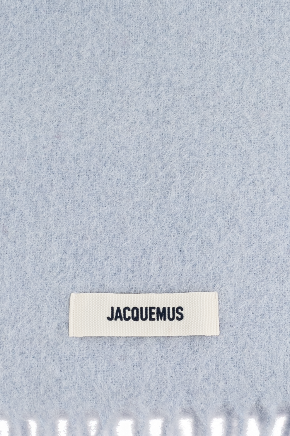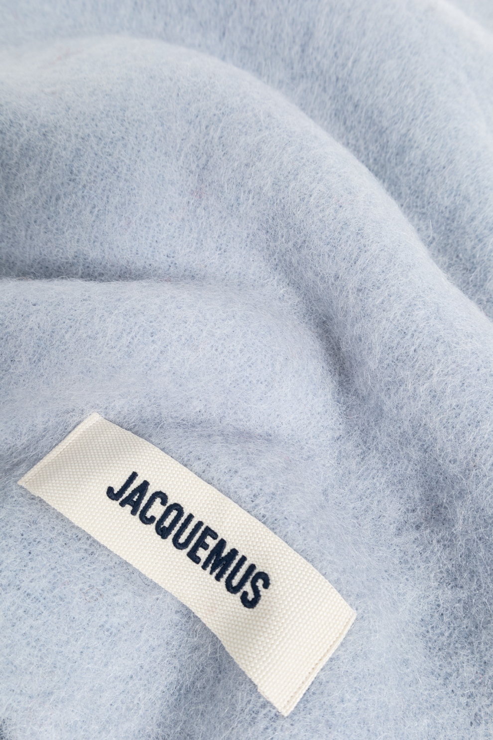 Пушистая фактура волокон создаёт живую, тактильно богатую поверхность, а контрастная бахрома на концах придаёт аксессуару лёгкое движение и непринуждённый шарм. Белая нашивка с крупной надписью JACQUEMUS завершает композицию, добавляя современный акцент брендинга, характерный для эстетики Симона Порт Жакмюса.