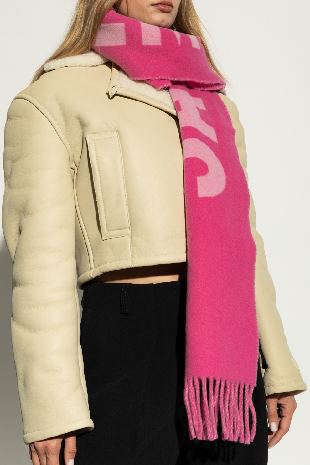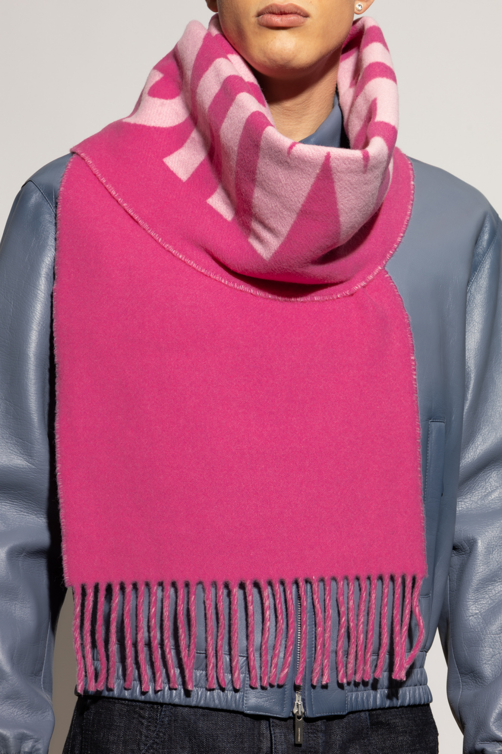 Насыщенный розовый оттенок, оттененный нежным светло-розовым логотипом, делает этот шарф уникальным аксессуаром для тех, кто ценит нестандартный стиль. Классическая прямоугольная форма, стандартная длина и длинная бахрома на концах придают шарфу нотку легкости и движения. Яркий, но в то же время ненавязчивый принт подчеркнет индивидуальность любого наряда, подчеркнув роскошный характер изделия.
