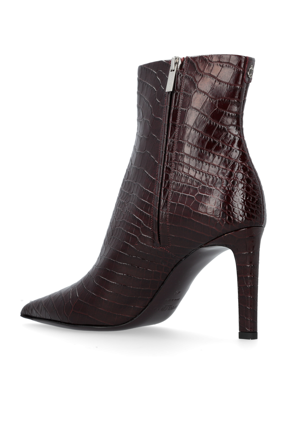 Отличительная тисненая текстура, напоминающая кожу крокодила, привлекает внимание. В сочетании с коричневым оттенком и изысканным блеском кожи она создаёт эксклюзивный дизайнерский образ. Молния на щиколотке обеспечивает лёгкость надевания, а логотип «JIMMY CHOO LONDON» — чёткое подтверждение престижности бренда.