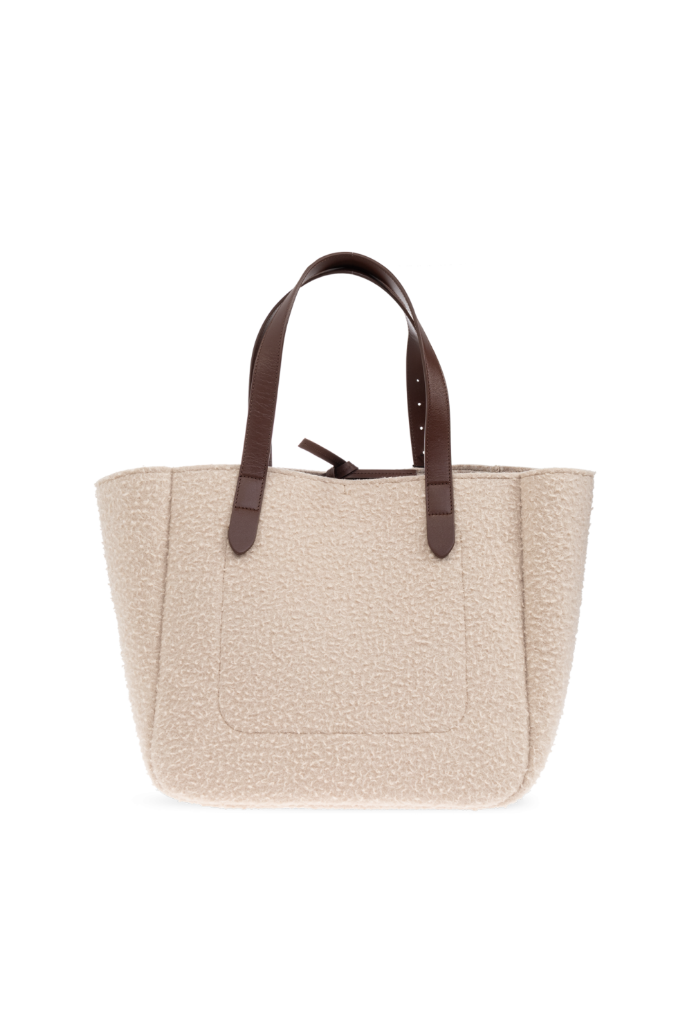 Внешняя отделка, обогащенная войлочной текстурой, восхищает своей мягкостью и эластичностью, подчеркивая роскошный характер изделия. Нежный бежевый цвет универсален, а общий вид дополняют длинные темно-коричневые ремешки из высококачественной телячьей кожи, прикрепленные к внешней стороне сумки и оснащенные серебряными регулируемыми пряжками.
