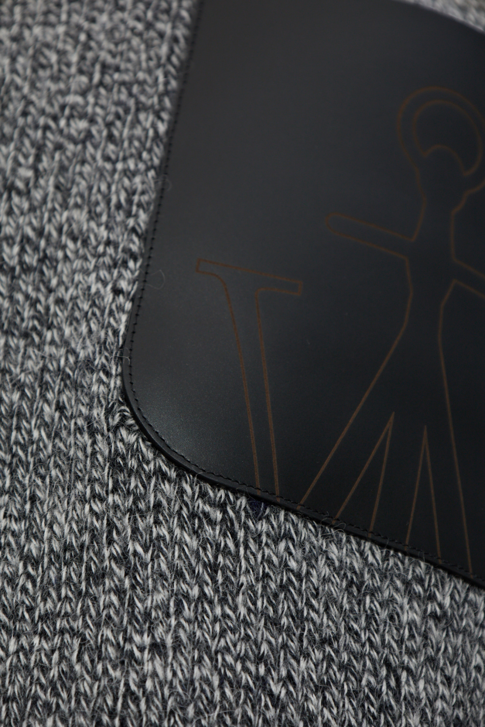 Это изделие выполнено из плотной меланжевой вязки из высококачественной шерсти, альпаки и акрила, с видимым переплетением, подчеркивающим его изысканный характер. Уникальной особенностью свитера является контрастная, гладкая черная аппликация, имитирующая карман на левой стороне груди. Она украшена тонким тиснением в виде стилизованного силуэта и буквы — ненавязчивой подписи дизайнера.