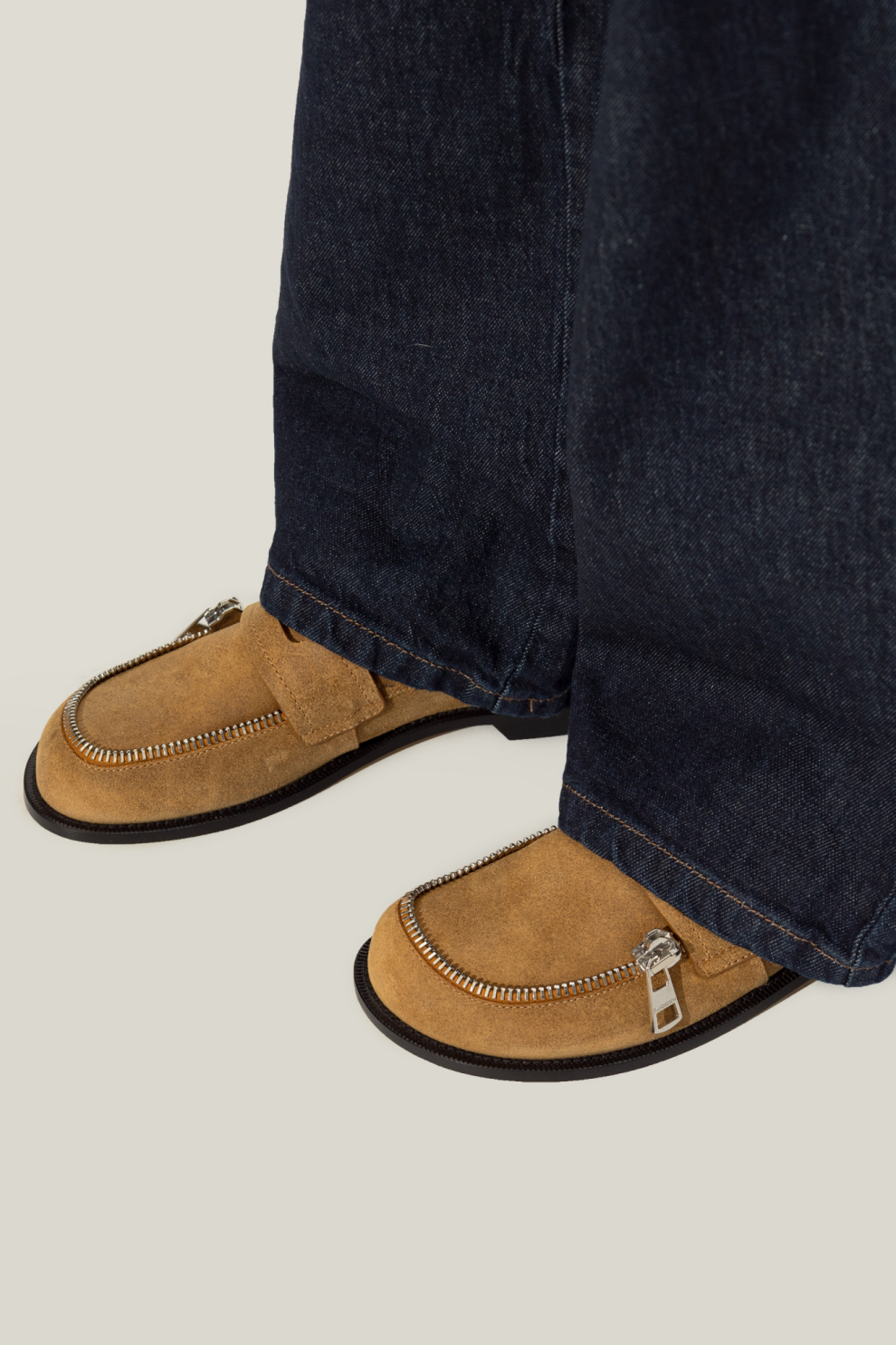 Классическая миндалевидная форма носка и плоский силуэт с низкой черной подошвой дополнены широким ремешком с горизонтальным вырезом и уникальной металлической молнией, проходящей по всей длине носка. Эта модель смело сочетает классический стиль с выразительной современностью, представляя собой уникальную интерпретацию женственности и мужественности в прикладном искусстве.