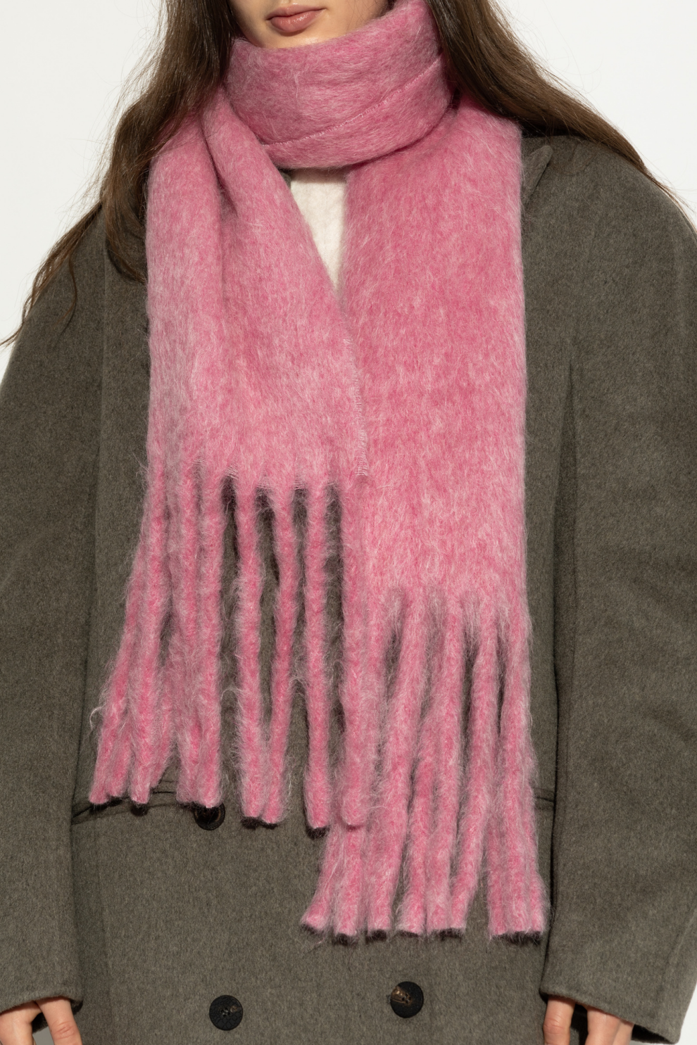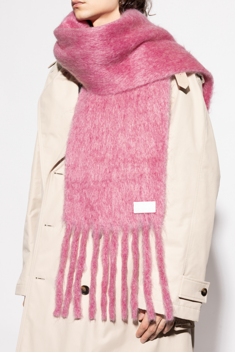 Мохеровый шарф KENZO — воплощение изысканного стиля в современной интерпретации. Невероятно пушистая и мягкая мохеровая пряжа насыщенного розового оттенка излучает роскошь и обеспечивает непревзойденный комфорт. Классическая удлиненная форма шарфа, украшенная густой бахромой, придает ему выразительный, но в то же время утонченный штрих элегантности.