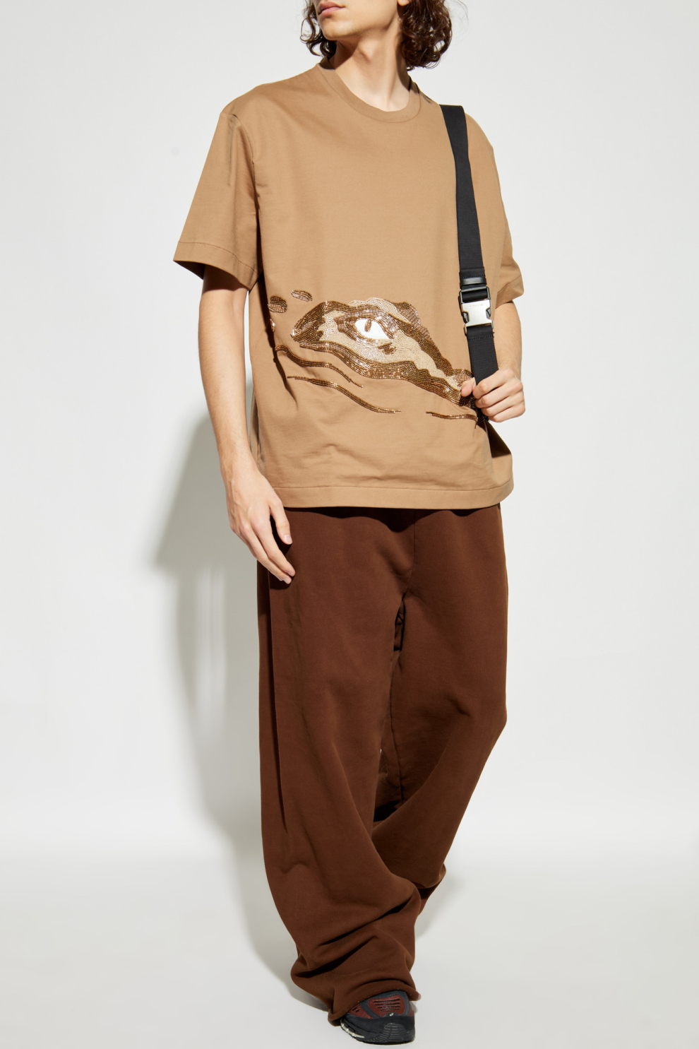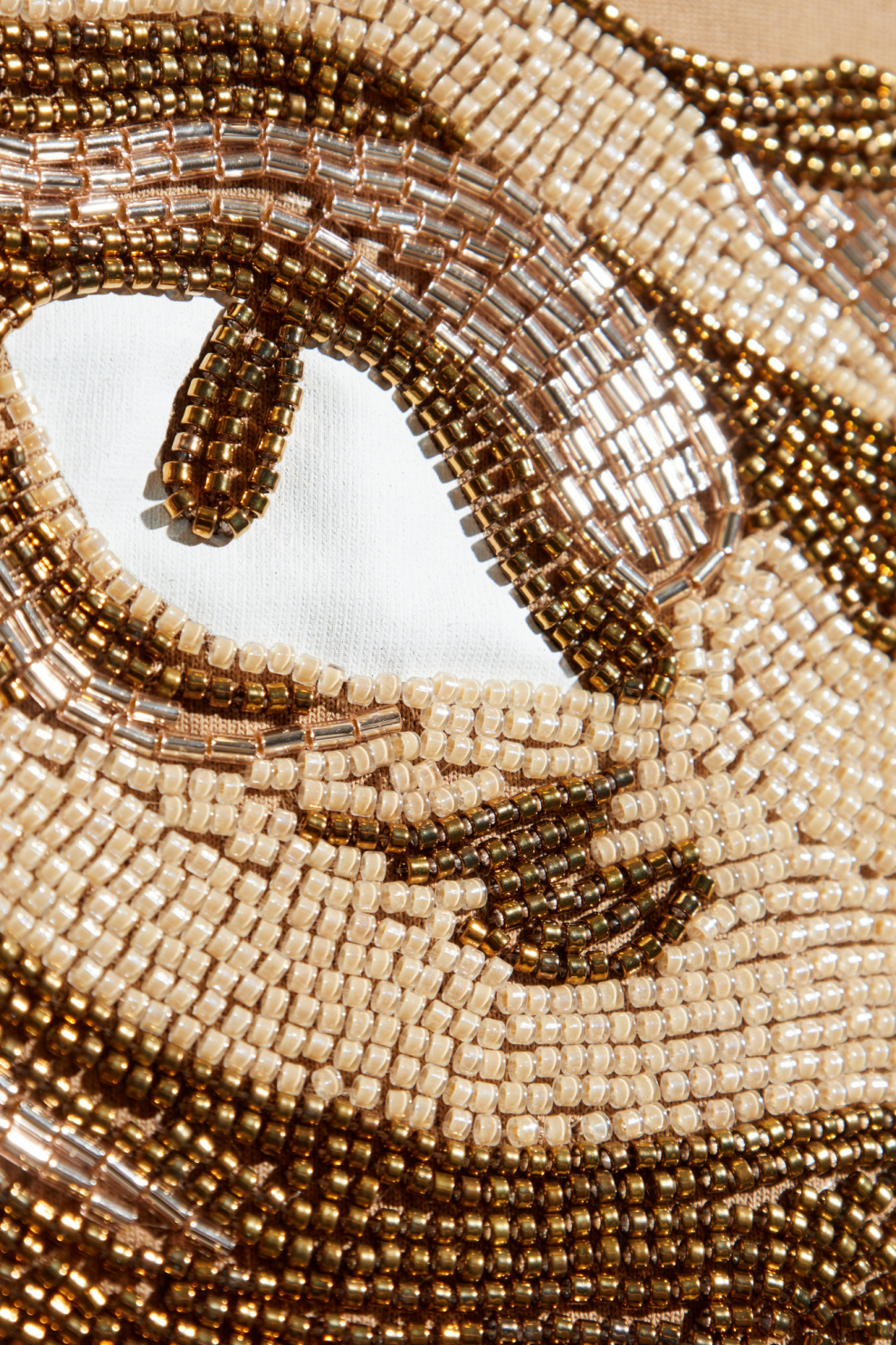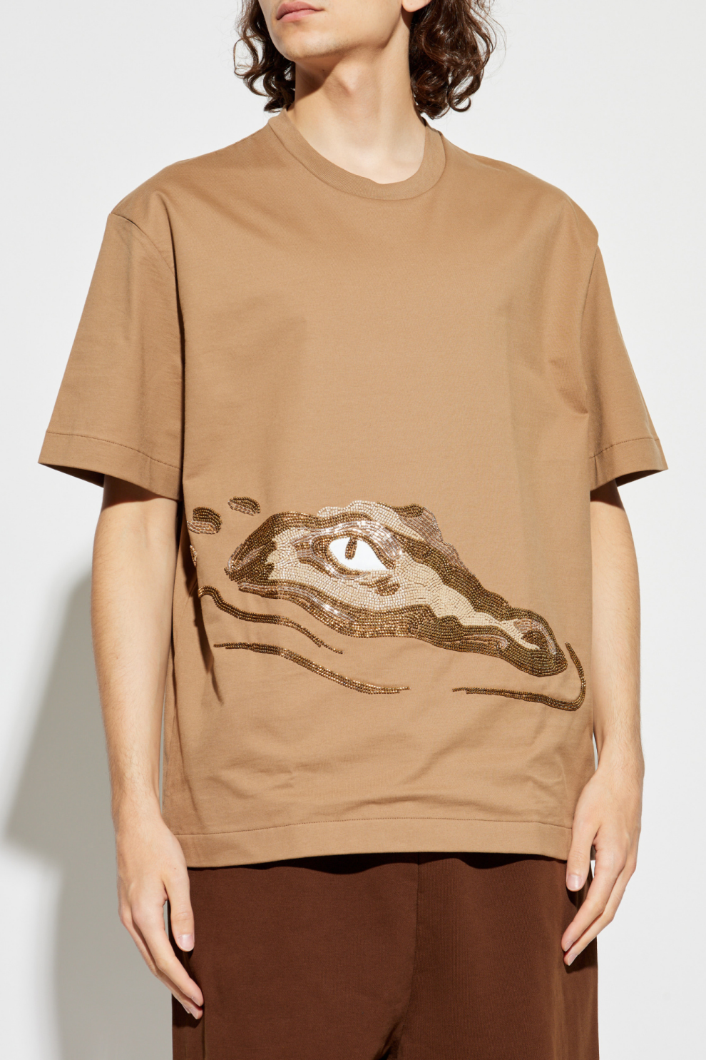 Уникальность этой футболки подчёркивает её асимметричная аппликация – объёмная вышивка бисером, точно повторяющая мотив глаза и головы крокодила. Искусно расположенные бусины и пайетки различных оттенков коричневого и бежевого придают ей самобытный и художественный вид. Классический крой с короткими рукавами и круглым вырезом делает эту футболку универсальной и в то же время уникальной.