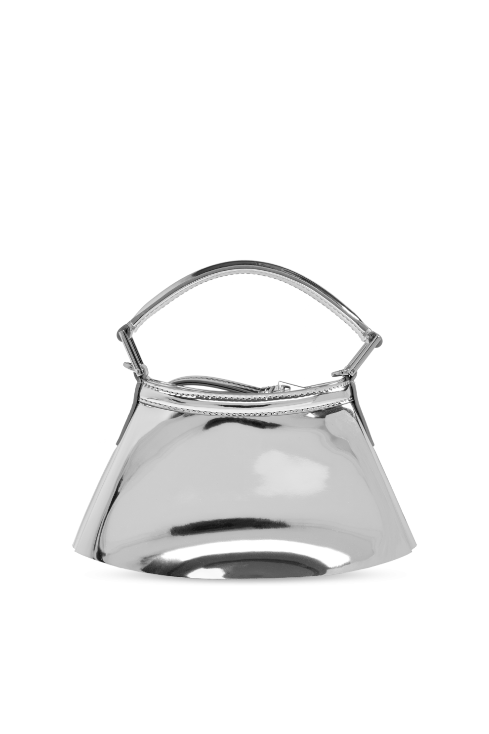 Внешний слой выполнен из высококачественной глянцевой кожи с серебристым блеском, что придаёт сумке изысканный и неповторимый вид. Уникальный металлический логотип в виде крокодила, аккуратно размещённый внизу, гармонично дополняет геометрические линии сумки. Декоративная молния и тонкая укреплённая ручка завершают этот уникальный дизайн, а внутренняя нашивка подчёркивает дизайнерское наследие сумки.