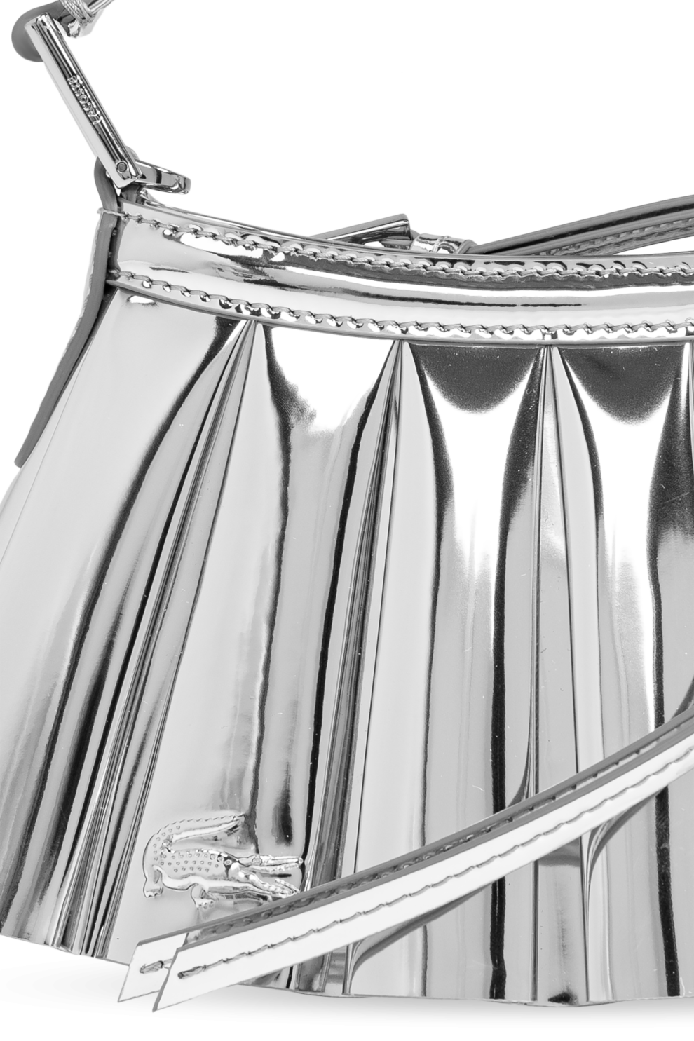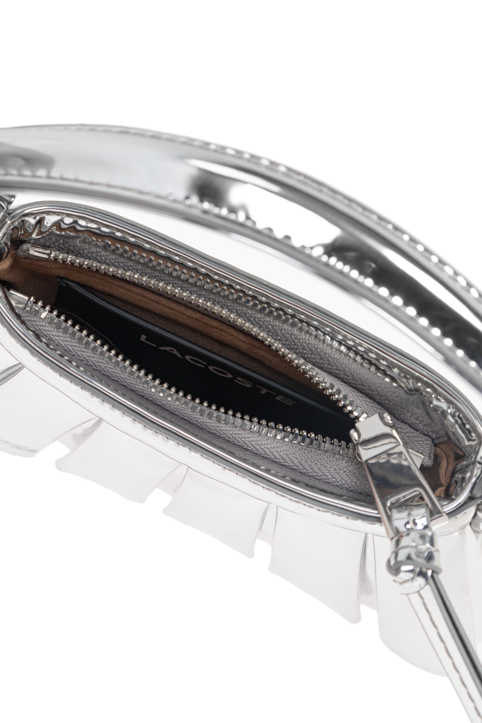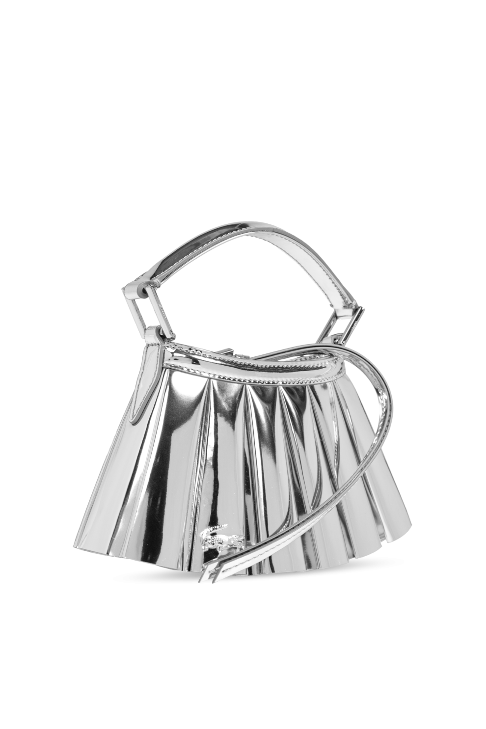 Серебристая мини-сумка через плечо Lenglen XXS из коллекции французского бренда Lacoste – квинтэссенция современной роскоши. Уникальный дизайн веерообразной формы, напоминающий теннисную юбку, с идеально четкими вертикальными складками создает динамичную и одновременно изысканную форму. Структура сумки тщательно продумана: зеркальные металлические складки привлекают внимание и подчёркивают эксклюзивный стиль.