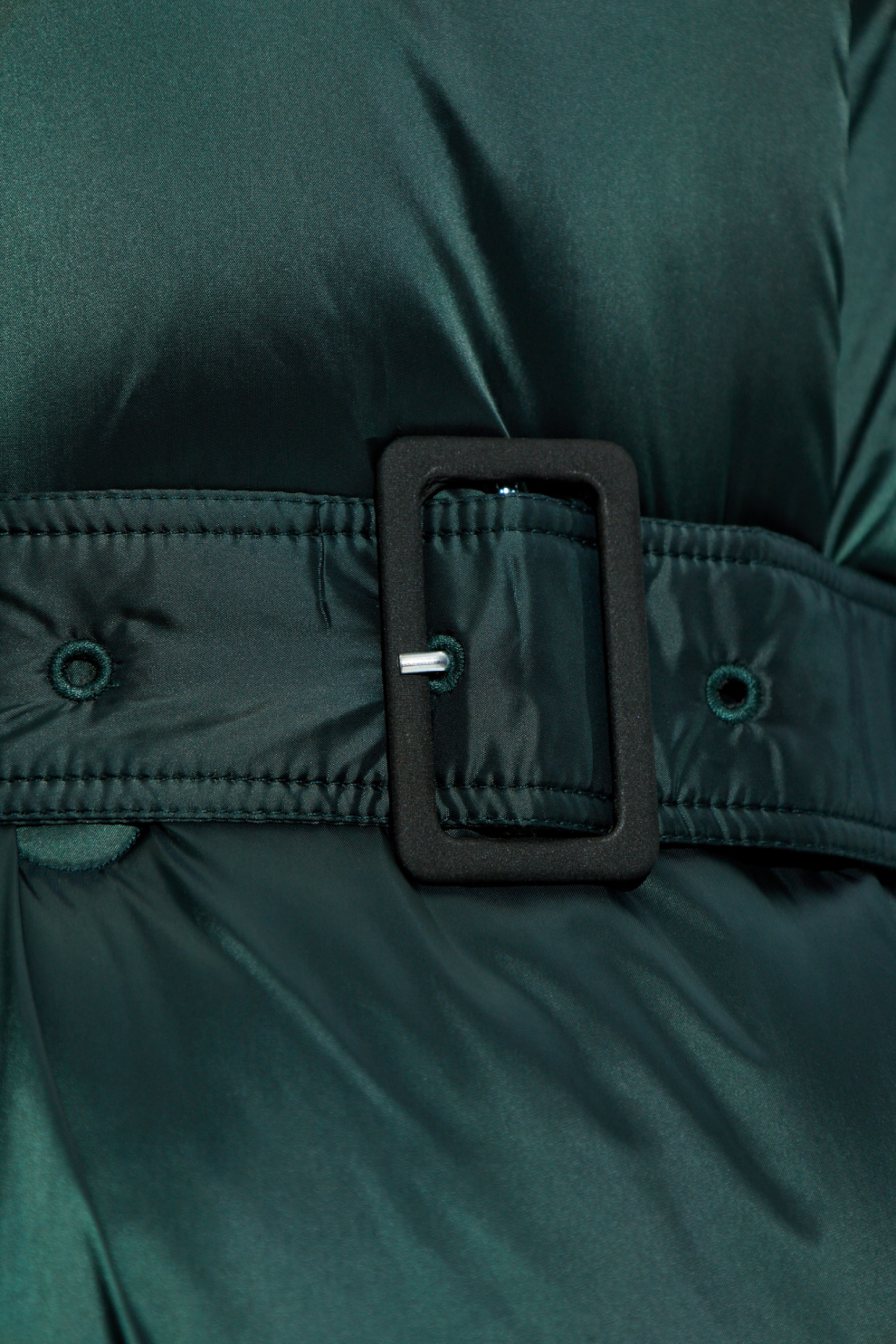 Отличительный атласный блеск придаёт зелёному пальто лёгкое мерцание. Высокий воротник-стойка защищает от ветра, а широкий регулируемый тканевый пояс подчёркивает талию, создавая женственный силуэт. Внешний материал – идеально гладкая смесь полиамида и полиэстера, а утеплитель из полиэстера обеспечивает тепло даже в самых суровых условиях.