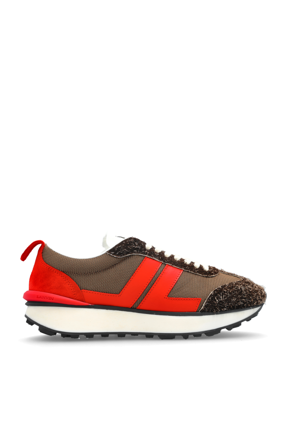 Кроссовки Lanvin Bumper воплощают изысканную гармонию вечной классики и современности. Их спортивный силуэт с низким голенищем завораживает обтекаемой формой, тонко напоминая о ностальгических беговых моделях прошлых лет. Коричневый верх из технической сетки дополнен накладками из кожи и замши, придающими модели необычайную визуальную глубину. Обращает на себя внимание уникальная текстура носка, вдохновленная отделкой из меха букле, а также яркие красные вставки из нубука и Г-образные ремешки.