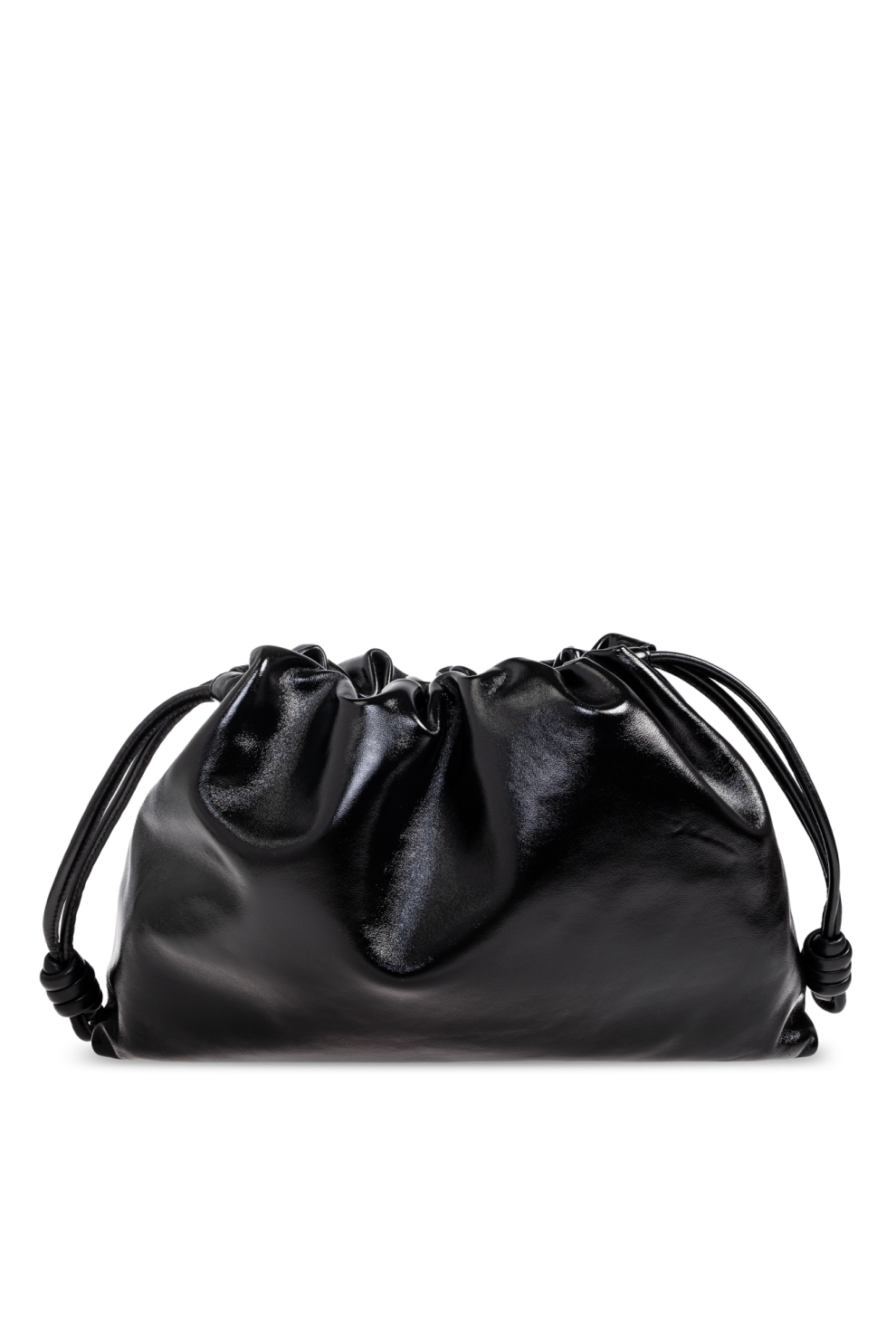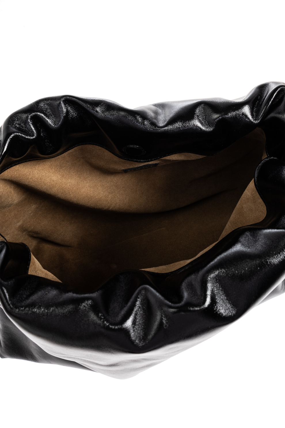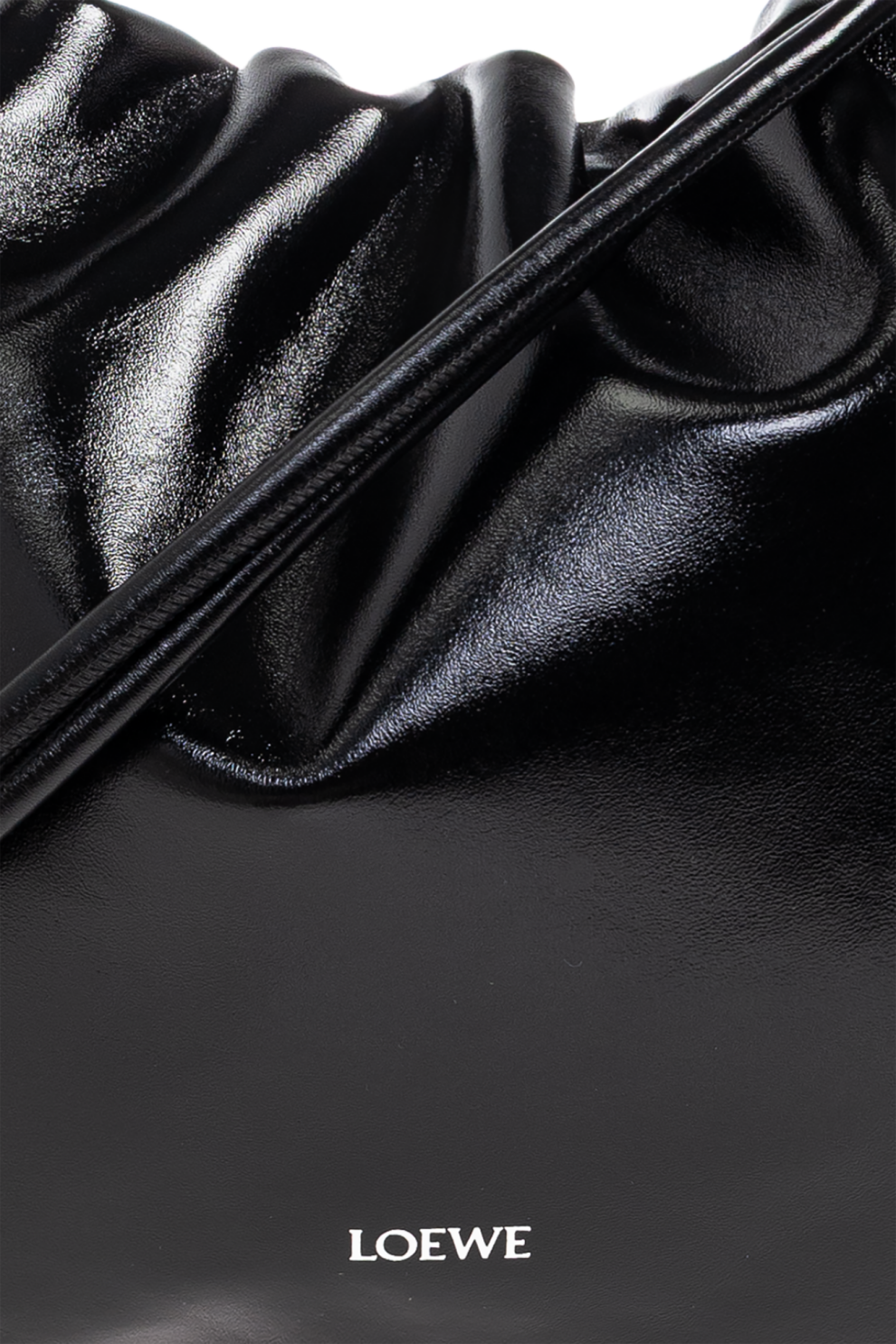 Её мягкий, струящийся силуэт с характерной сборкой по верхнему краю создаёт эффект непринуждённой элегантности и пластичности. Глубокий чёрный оттенок гладкой глянцевой кожи усиливает ощущение утончённости, придавая изделию вневременной характер и универсальность.