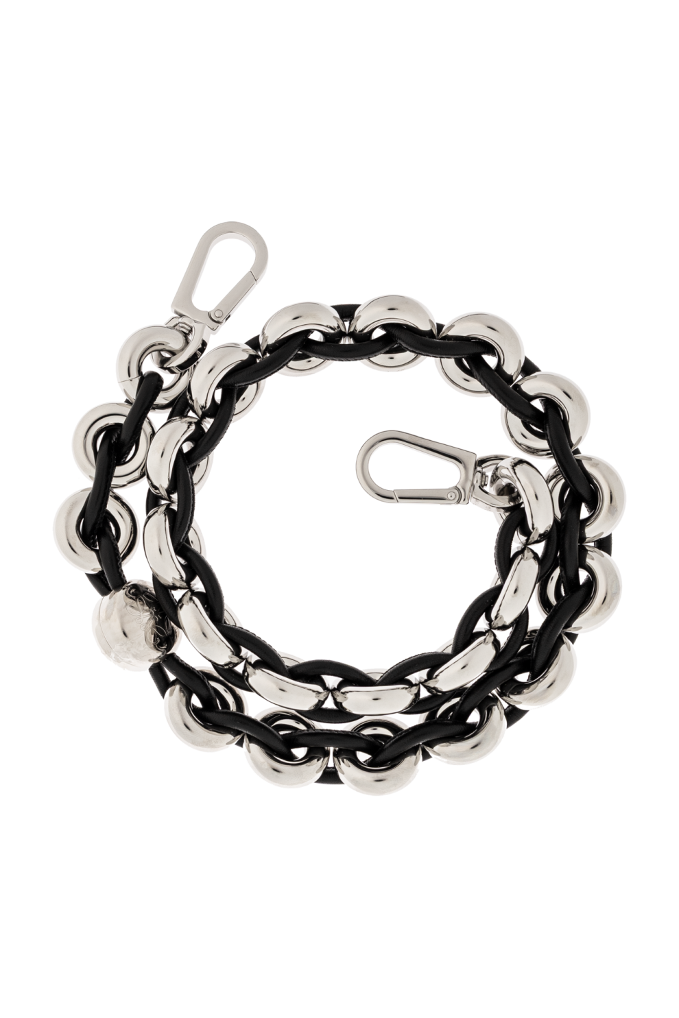 Особого внимания заслуживает массивная цепочка-ремень с серебристым блеском и чёрными переплетениями: она не только служит функциональным элементом, но и становится акцентным украшением, придающим образу современную динамику и характер.
