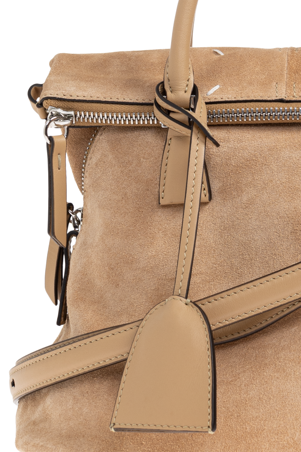 Модель выполнена из благородной бежевой замши с кожаными вставками. Бархатистая фактура подчёркивает глубину оттенка, а деликатный естественный блеск придаёт изделию ощущение сдержанной роскоши. Контраст текстур создаёт визуальную многослойность и подчёркивает мастерство исполнения.